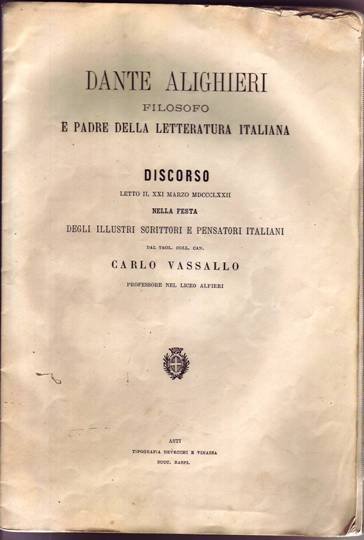 Fascicolo in 4 piccolo, brossura editoriale, titolo al piatto, occhiello, frontespizio, dedicatoria, 35 pp. Discorso letto il 21 marzo 1872 nella festa degli illustri scrittori e pensatori Italiani dal Professor Carlo Vassalli su Dante filosofo. Lievi mende d'uso alla legatura. Interessante e di piacevole lettura.