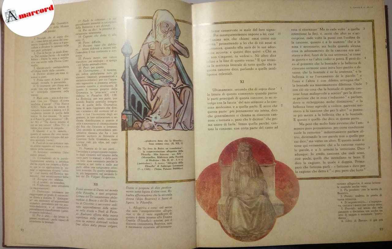 Dante, Convivio, Fabbri, 1965, in-4, rilegato similpelle con scritte e fregi oro, pp. 376, illustrazioni a colori n.t. A cura di Daniele Mattalia. Volume VIII di "Tutte le opere di Dante" edizione fittamente annotata e illustrata.