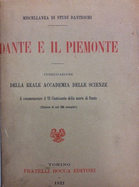 DANTE E IL PIEMONTE. - Pubblicazione della Reale Accademia delle Scienze. A commemorare il VI Centenario della morte di Dante.