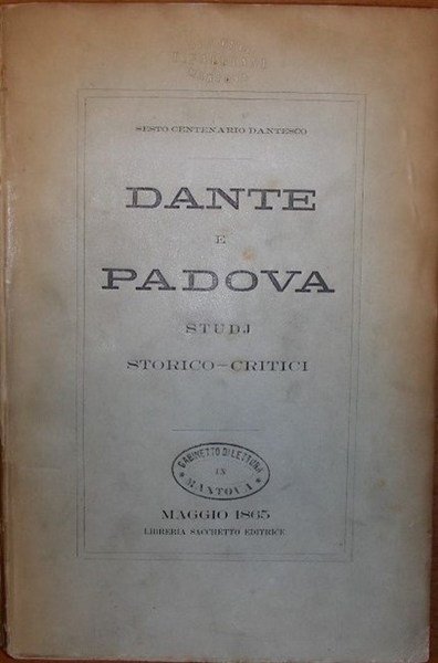 in-8, pp. XII, 449, bross. edit. Scritti di A. Gloria, E. Salvagnini, G. Di Leva, G. Zanella, A. Tolomei, D. Barbaran, A. Cittadella. Documentata analisi della presenza di Dante in Padova, particolarmente interessante la ricostruzione immaginaria dell’incontro di Dante con Giotto (Selvatico). Olschki, Dantesca, 356. In occasione del sesto centenario dantesco. Timbro di bibl. estinta. [410]