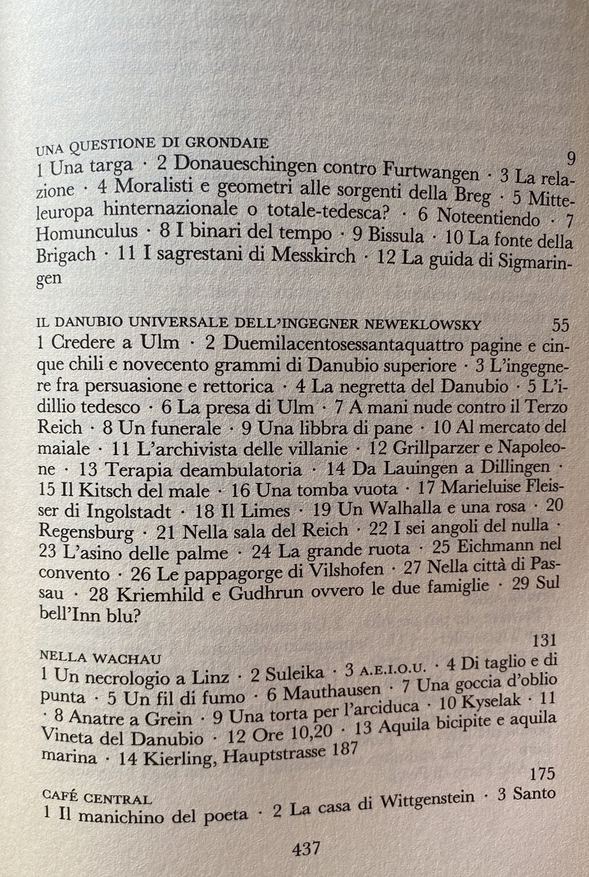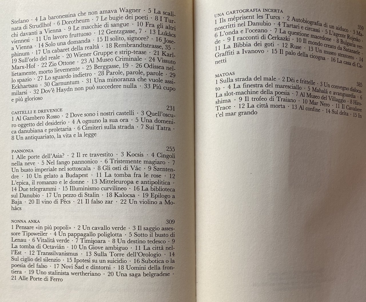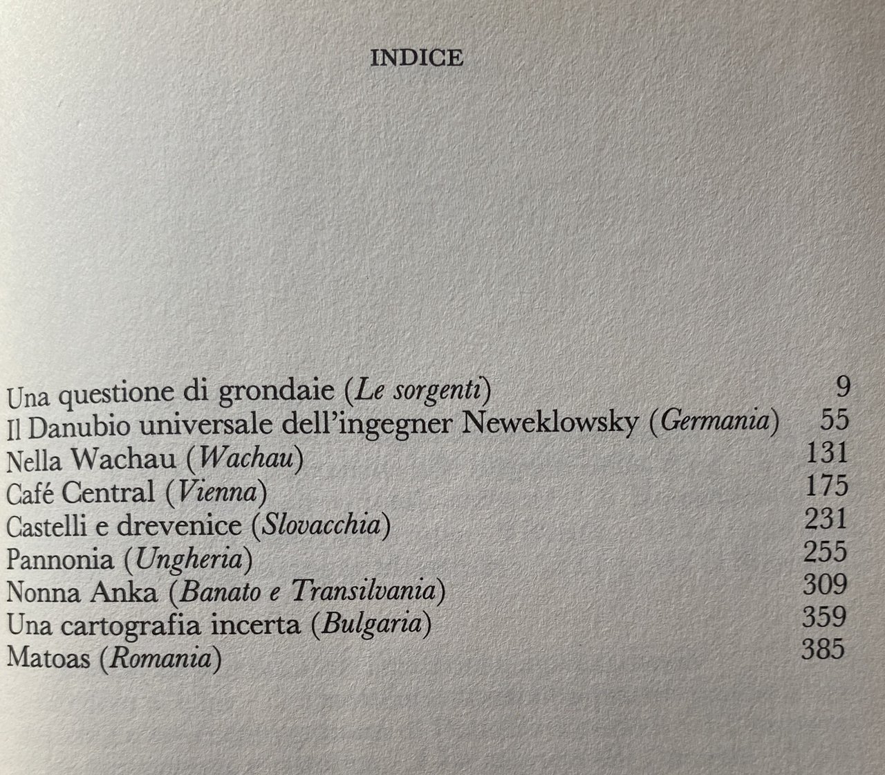 Soggetti: Letteratura Viaggio sentimentale Memorie Biografie Racconti Itinerario Europa Sorgenti Danubio universale Neweklowsky Germania Wachau Café Central Vienna Castelli Drevenice Slovacchia Pannonia Ungheria Banato Transilvania Cartografia Bulgaria Matoas Romania Impero absburgico Austria Bela Repubblica ceca Praga Crkva Braila Bratislava Breg Brigach Budapest Bulgaria Elias Canetti Canzone dei Nibelunghi Casa Céline Chiesa Chilometri Città Civiltà Contadini Cultura danubiana Destino Donaueschingen Fiume Fluire Fotografie Furtwangen Germania Goethe Grillparzer Imperiale Jean Paul Kafka Lirica Lukács Magiari Malinconia Mare Mistero Mitteleuropa Mondo Morte Mostra Museo Napoleone Nazionale Nazismo Nero Nonna Anka Nostalgia Paesaggio Paese Panait Istrati Passau Pathos Poesia Politica Popoli Racconto Regensburg Romanzo Scrittori Serbi Serbia Slavi Sighisoara Slovacchia Società Sorgenti Stalin Stifter Storia Strada Sulina Svevi Tedesco Terzo Reich Thrän Timisoara Tradizione Tragedia Turchia Ungherese Viennese Villaggio Vojvodina Trieste Dalmazia Istria Luoghi Persone Cammino Mar Nero Germanstica Tappe Percorsi Est Belgrado Yugoslavia Sofia Novi Sad Kitsch Musil Singer Ebrei Pilgrim Wagner Attila Fritz Lang Heidegger Bucarest Comunismo Unione Sovietica Ion Luca Caragiale Guerra Russia Peter Altenberg Holderlin Torre dell'orologio Libri fuori catalogo Saggistica Collezionismo Classici Donaueschingen Furtwangen Breg Brigach Messkirch Sigmaringen Neweklowskt Ulm Rettorica Mercato Maiale Villanic Grillparzer Napoleone Lauingen Dillingen Marieluise Fleisser Ingolstadt Limes Walhalla Regensburg Eichmann Vilshofen Passau Kriemhild Gudhrun Inn WACHAU Linz Suleika Mauthausen Grein Kyselak Vineta Aquila Kierling Hauptstrasse Wittgenstein Stefano Strudlhof Dorotheum Gentzgasse Rembrandtstrasse Wiener Gruppe Strip-tease Karl Marx-Hof Berggasse Eckhartsau Carnuntum Haydn Gambero Rosso Cimiteri Strade Antiquariato Asia Kocsis Neve Fango pannonico Vác Epica Donne Illuminismo Biblioteca Stalin Kalocsa Baja Vino Pécs Lenau Octavián Transsilvanismus Silenzio Suicidio Poesía Dintorni Frontiera Werther Ferro Tartari Circassi Questione macedone Satanaele Cerkazki Goti Ruse Graffiti Ivanovo Mahalá Avanguardia Traiano Delta Narrativa storica Storici Ristoranti Cibo locale Literature Sentimental journey Memories Biographies Stories Itinerary Europe Sources Universal Danube Germany Castles Slovakia Hungary Transylvania Cartography Habsburg Empire Czech Republic Prague Song of the Nibelungs House Church Kilometers City Civilization Peasants Danubian culture Destiny River Flow Photographs Furtwangen Imperial Germany Magyars Melancholy Sea Mystery Central Europe World Death Exhibition Museum Napoleon National Nazism Black Grandmother Nostalgia Landscape Country Poetry Politics Peoples Story Novel Writers Serbs Slavs Slovakia Society Sources History Road Swabians German Third Reich Tradition Tragedy Turkey Hungarian Village Dalmatia Places People Way Black Sea Germanistics Stages Routes East Belgrade Yugoslavia Jews Communism Soviet Union War Clock Tower Out of print books Non-fiction Collectibles Classics Rhetoric Market Pig Napoleon Eagle Red Shrimp Cemeteries Roads Antiques Snow Pannonian mud Epic Women Enlightenment Library Octavian Silence Suicide Poetry Surroundings Border Iron Tartars Circassians Macedonian question Avant-garde Trajan Historical fiction Historians Restaurants Local food