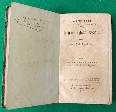 In 8° grande; (2), 366 pp. Legatura coeva in pieno cartoncino foderato con bella carta marmorizzata. Al dorso tassello con titolo e anno manoscrritti in bella e chiara grafia coeva. Antica nota di possesso privto al recto della prima carta bianca Giacomo Meyer di Zurigo che identifica l'esemplare come appartenuto, probabilmente al noto imprenditore svizzero, originario di Regensdorf in provincia di Zurigo, Giovanni Giacomo Meyer che ebbe un notevole sviluppo del sistema industirale meridioanle dove a Piedimonte Matese (Caserta) fu caposala dell'industria tessile qui creata dallo Svizzero, Giovanni Giacomo Egg. Esemplare in ottime condizioni di conservazione. Prima edizione di quest'opera del celebre storico e professore universitario tedesco, Julius August Remer (1738 Braunschweig - 1803 Helmstedt). Remer studiò teologia a Helmstedt e Gottinga. Nel 1763 trovò lavoro come tutore pubblico, presso il Collegium Carolinum di Braunschweig. Nel 1774 Remer successe alla cattedra di Storia Universale già occupara da Justus Friedrich Wilhelm Zachariae. Massone convinto, nel 1787 si trasferì a Helmstedt quando l'Università gli assegnò la cattedra di professore ordinario di storia e statistica. Personaggio di grande erudizione fu molto apprezzato dai contemporanei, tanto che nel 1796, fu nominato consigliere di corte. Quella qui presentata, in prima edizione, è una delle sue opere più importanti. Altre sue opere di notevole importanza furono l'Handbuch der allgemeinen Geschichte del 1771,<BR>il Tabellarische Uebersicht der wichtigsten statistischen Veränderungen in den vornehmsten europäischen Staaten, 17861794, Geschichte der französischen Constitutionen, 1795, 2. Aufl. 1808 e Historische Basreliefs in Darstellungen ausgezeichnet merkwürdiger Scenen aus der Geschichte, Halle, 1803. Prima edizione in ottime condizioni di conservazione.