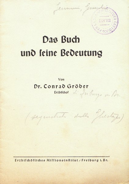 In 16°, fascicolo, pp. 24; timbretto Istituto Cattolico per la Stampa al piatto ant.; al piatto ant. è riportata la nota "sequestrato dalla Ghestapo"; l'arcivescovo di Friburgo Conrad Grober fu un accesso oppositore del Nazismo; buon es.
