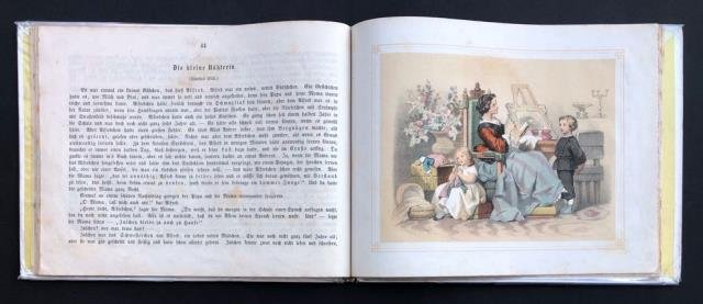 Stuttgart, 1850 circa. Album in oblungo, cm 20,5 x 26,5 circa (alla legatura), cm 19,5 x 24,5 (alle tavole), titolo tradotto "Il primo piccolo libro", pp. 56 con testo in gotico tedesco e 06 litografie fuori testo in colore d'epoca, inquadrate da filetto decorativo e raffiguranti scene con bambini in ambiente domestico e familiare, contropiatti e fogli di guardia in carta gialla, leg. orig. in tutto cartonato rosa / verde / bianco con titoli e impressioni oro. Usuali imperfezioni del tempo, tenue e piacevole la coloritura delle tavole, buono stato dell'insieme. .