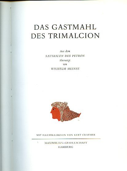 In-4° (306x215mm), pp. XII, 78, (4), legatura editoriale t. tela gialla con figura di antica anfora impressa in argento al piatto e titolo in argento al dorso. Illustrazioni a colori e in b.n. di Kurt Craemer n.t. Una vignetta a colori del Craemer al frontespizio. Perfetto stato. Ristampa della settecentesca traduzione tedesca dell'Heinse della 'cena di Trimalcione', l'episodio più celebre del 'Satyricon', adorna delle belle illustrazioni del Cramer. La cura tipografica del volume, impresso in soli 1200 esemplari, è dovuta ad Hans Mardersteig e alla veronese Stamperia Valdonega.