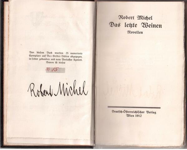 cm. 12 x 17,50 - legatura in pelle -piatti con cornice in oro-titolo in oro al dorso- ex libris alla prima carta bianca- pp. 220- rarissima e pressochè introvabile opera dello scrittore di origine boema, nato a Kutnà Hora il 24/2/1876 e morto a Vienna il 12/2/1957 - Edizione numerata di 25 esemplari su carta fatta a mano e firmati dall'autore ( il nostro è il n. 15 ) - In ottimo stato di conservazione<BR>