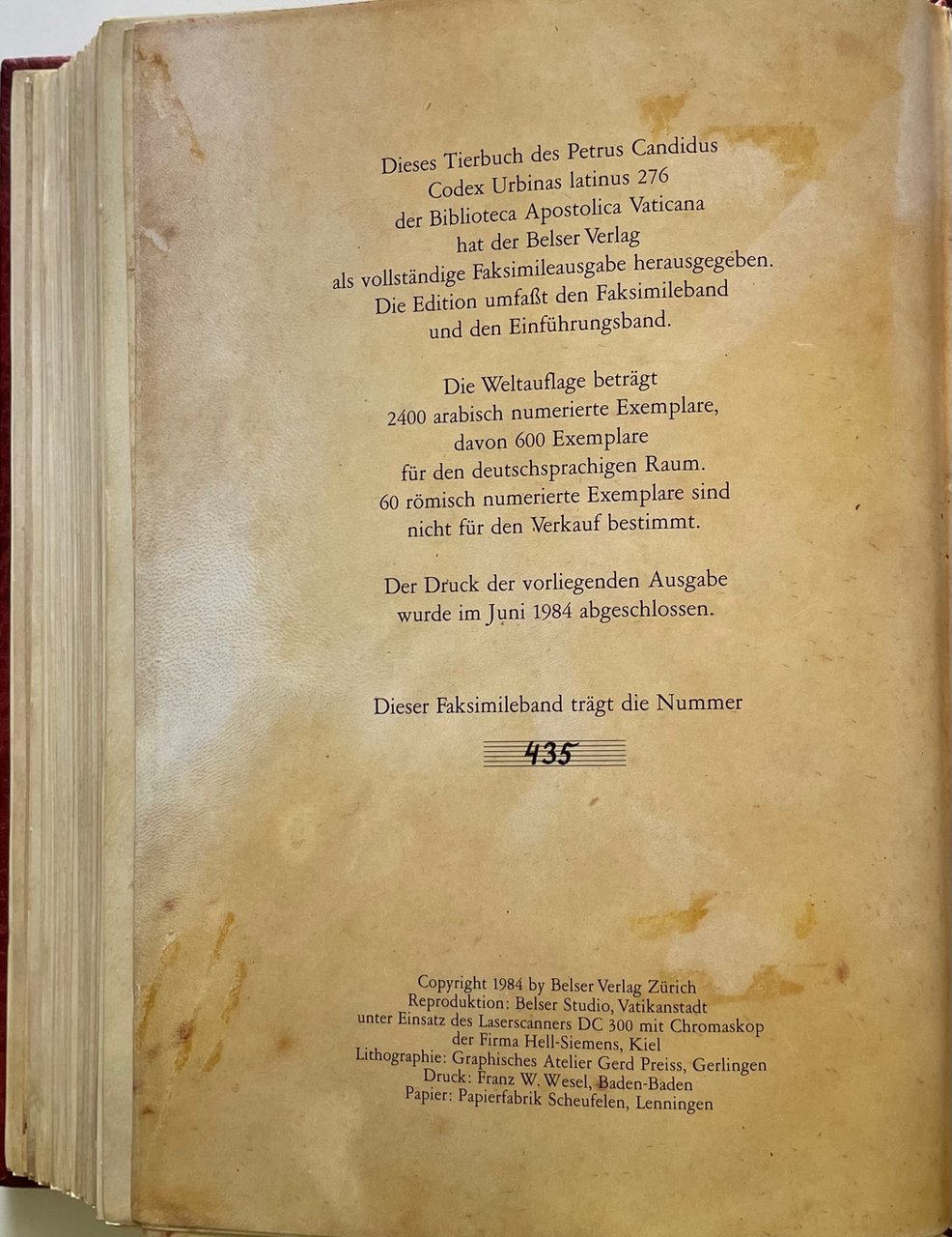 Das Tierbuch des Petrus Candidus (Il libro degli animali. Bestiario di Pier Candido Decembrio, The Animal Book of Pier Candido). Città del Vaticano, Biblioteca Apostolica Vaticana, MS Urb. lat. 276. Belser Verlag, Zurigo, 1984. Riproduzione in facsimile del manoscritto, in latino, che contiene testi e immagini con descrizione di animali, mammiferi, uccelli, insetti. L’opera prende il nome dall'autore, noto umanista italiano. Il manoscritto è datato all'anno 1460 ed è stato forse prodotto nello scriptorium di Urbino. Legatura in pelle con impressioni in oro sui piatti e sul dorso. Pagine 462, Formato 19x26,5 cm. Commentario in italiano. Cofanetto di custodia. Tiratura limitata e numerata di 2400 esemplari. Condizione ottima.