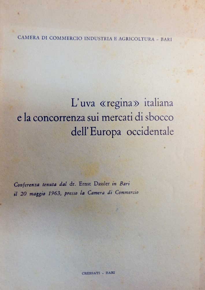 L’uva regina italiana e la concorrenza sui mercati di sbocco dell’Europa occidentale. Conferenza tenuta dal dr. Ernst Dassler in Bari il 20 maggio 1963 presso la Camera di Commercio, Cressati, Bari 1963?, pp. 22, cm 24, fascicolo spillato. In testa al frontespizio: Camera di Commercio Industria e Agricoltura, Bari. Lievi segni del tempo, per il resto ben conservato. Estremamente raro.