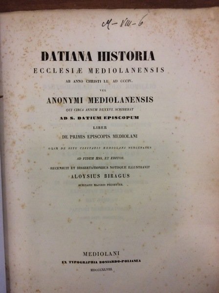 DATIANA HISTORIA ECCLESIAE MEDIOLANENSIS AB ANNO CHRISTI LI AD CCCIV. - Vel Anonymi Mediolanensis qui circa annum DXXXVI scribebat ad S. Datium Episcopum liber de primis Episcopis Mediolani...
