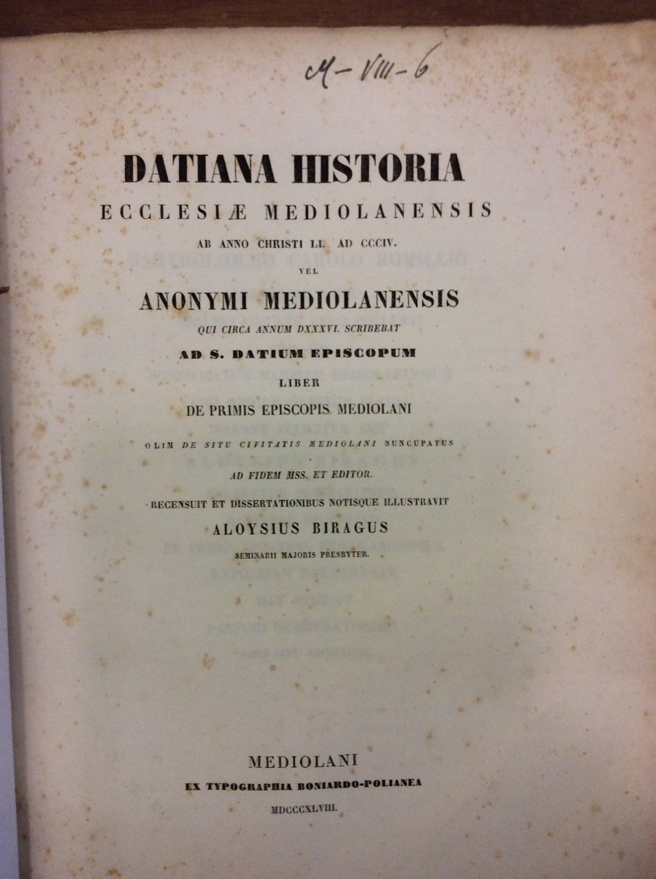 In-4 p. (mm. 290x213), brossura orig. (dorso rifatto), pp. XLVIII,119, testo su due colonne. "Ad fidem Mss. et editor, recensuite et dissertationibus notisque illustravit Aloysius Biragus, Seminarii Majoris Presbyter". Il volume porta alcune incisioni nel testo e 5 tavole fuori testo che raffigurano illustri personaggi della chiesa milanese, simboli cristiani dei sepolcri, una pianta antica di Milano e il facsimile di un manoscritto della Biblioteca Ambrosiana. "Edizione originale". Cfr. Cat. Hoepli,557. Con qualche fiorit. ma buon esemplare.