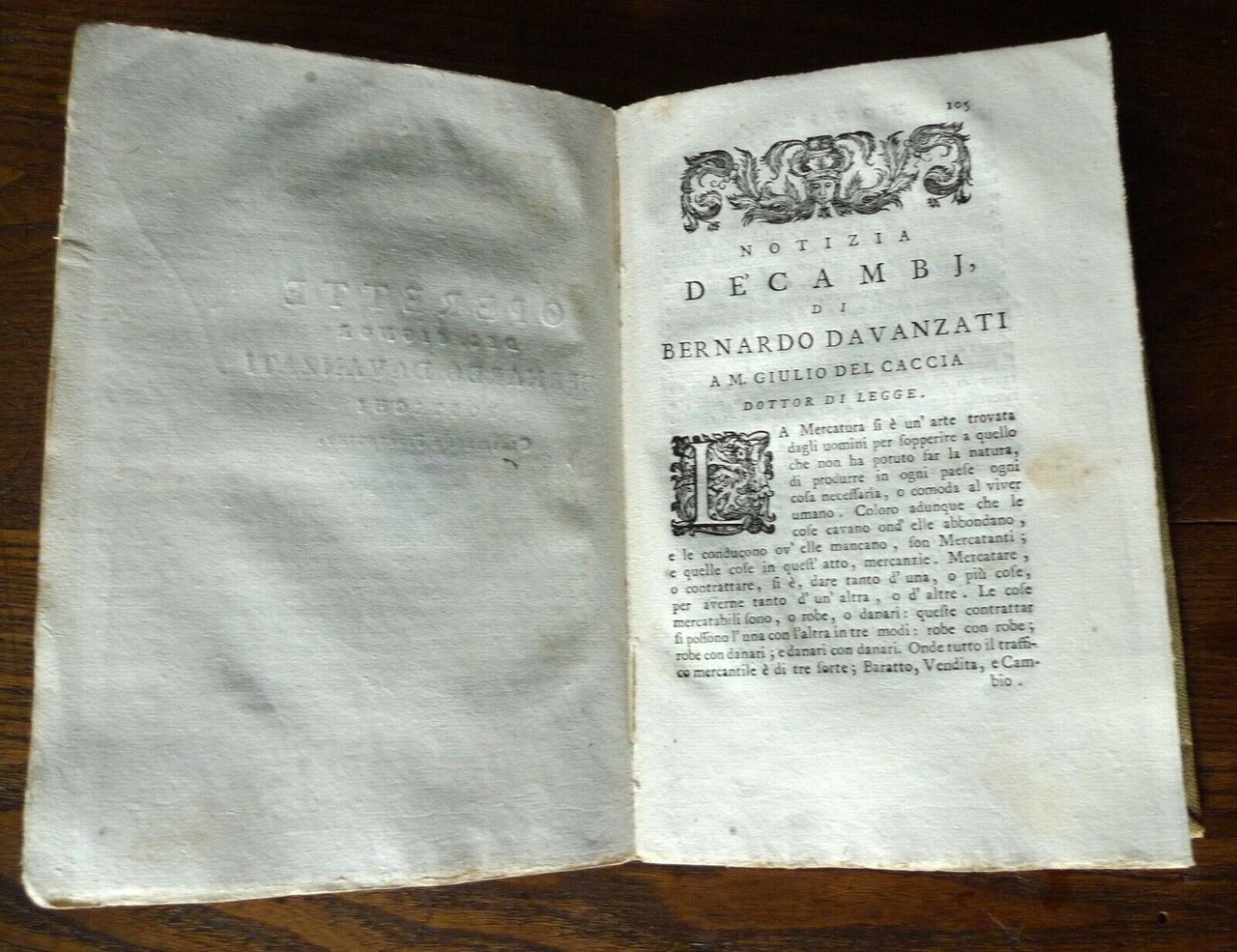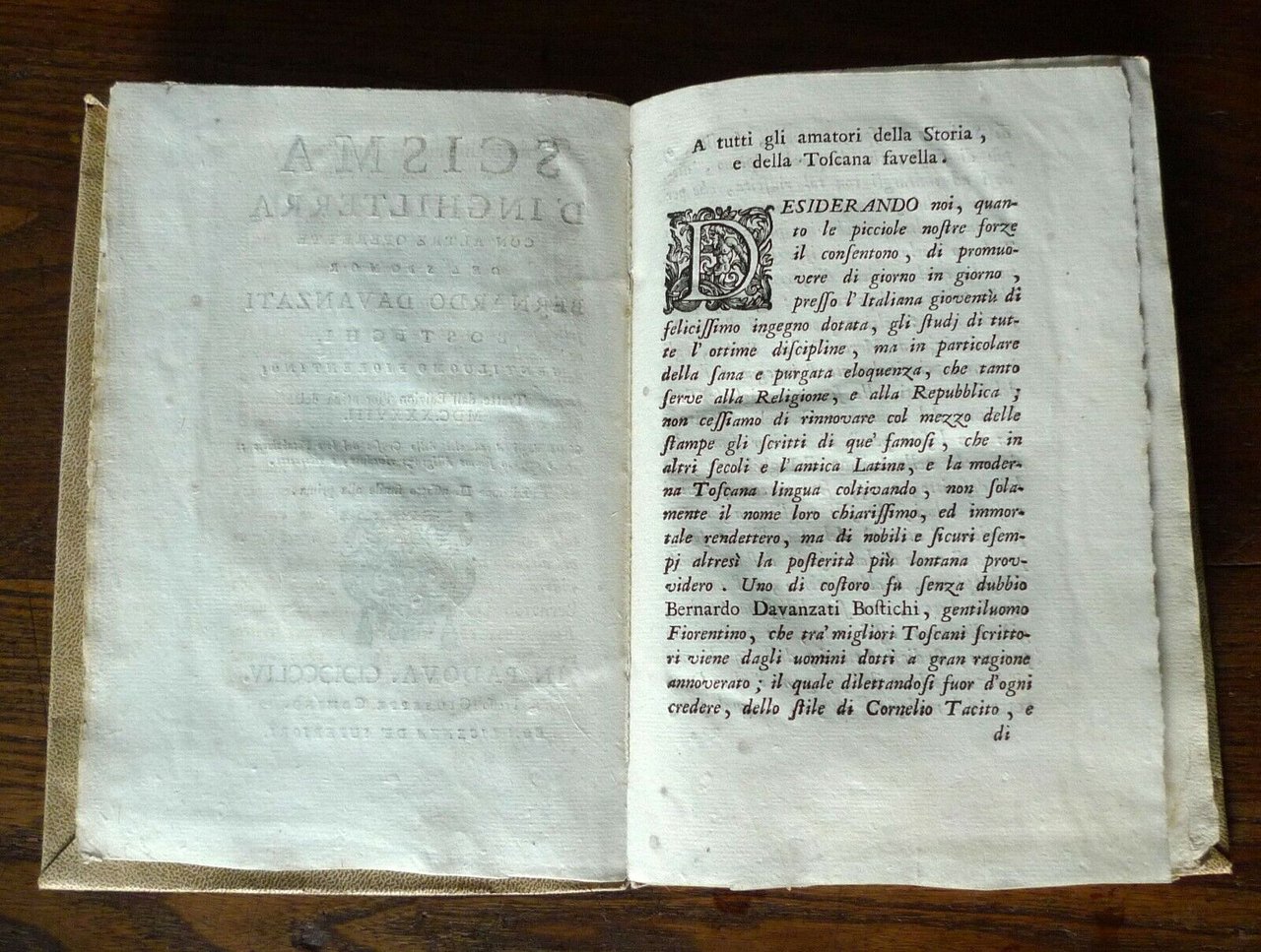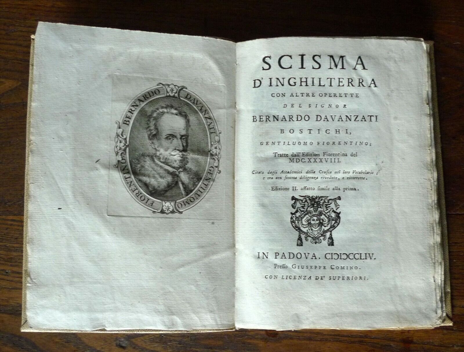 SCISMA D'INGHILTERRA CON ALTRE OPERETTE DEL SIGNOR BERNARDO DAVANZATI BOSTICHI, GENTILUOMO FIORENTINO;TRATTE DALL'EDIZION FIORENTINA DEL MDC.XXXVIII. CITATA DAGLI ACCADEMICI DELLA CRUSCA NEL LORO VOCABOLARIO; E ORA CON SOMMA DILIGENZA RIVEDUTE, E RICORRETTE. EDIZIONE II. AFFATTO SIMILE ALLA PRIMA.IN PADOVA, 1754, PRESSO GIUSEPPE COMINO,copertina morbida, rilegatura in pergamena,sovraccoperta in carta, 19,5x14 cm., pp.222,con un ritratto dell'Autore all'antiporta,una tavola ripiegata fuori testo,le OPERETTE comprendono:Notizia de' cambi, Lezione delle monete,Orazione in morte del Gran Duca Cosimo I.,Accusa data dal silente al travagliato,Orazione in genere deliberativo sopra i ProvveditoriDell'Accademia degli Alterati,Coltivazione Toscana delle viti, e d'alcuni arboripeso: g.260