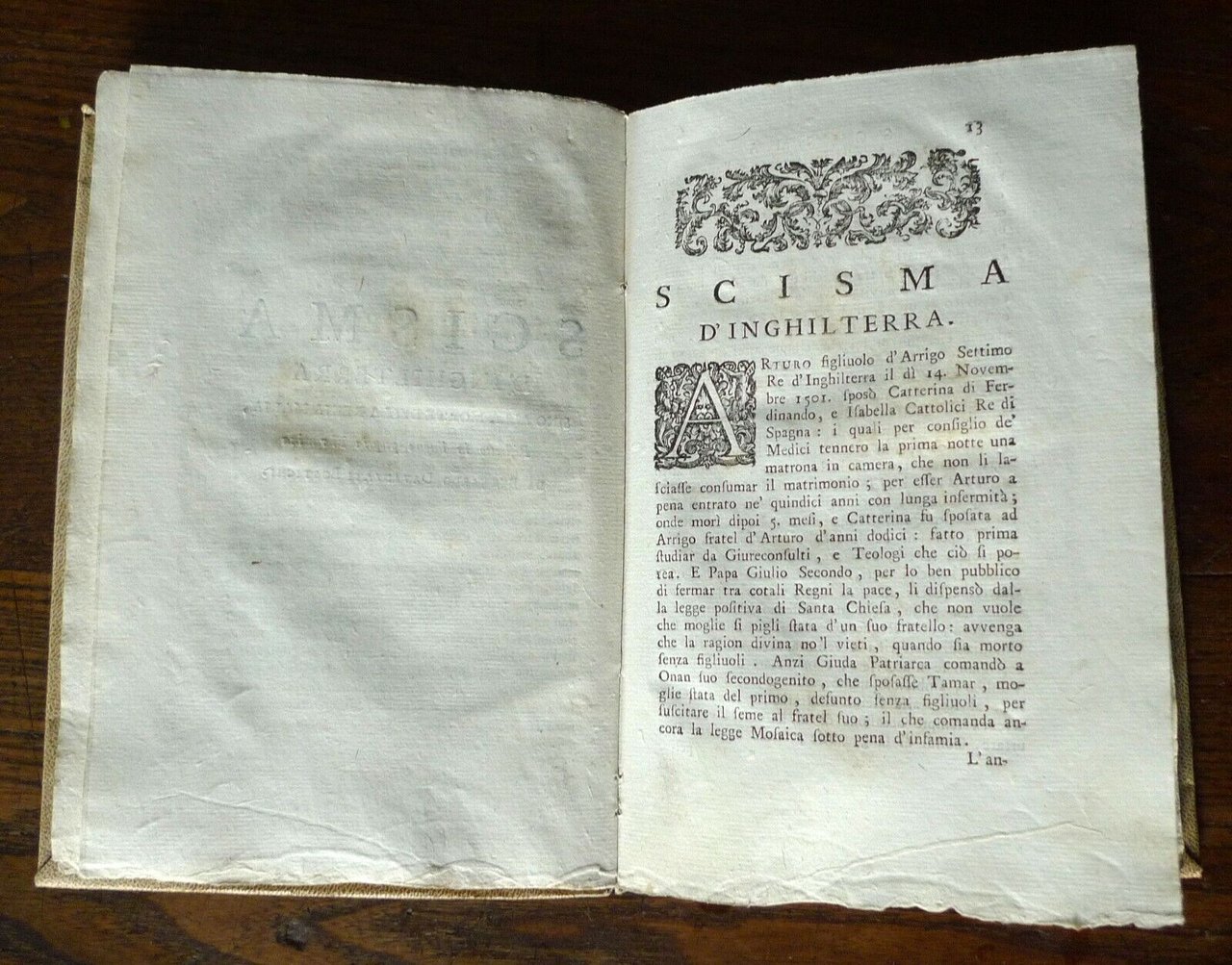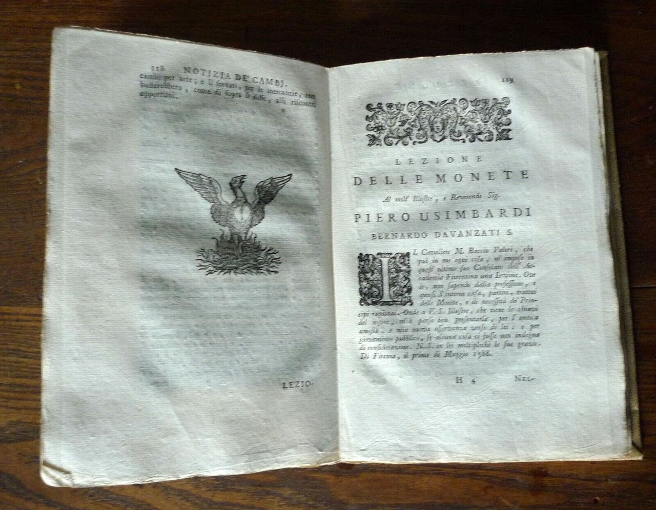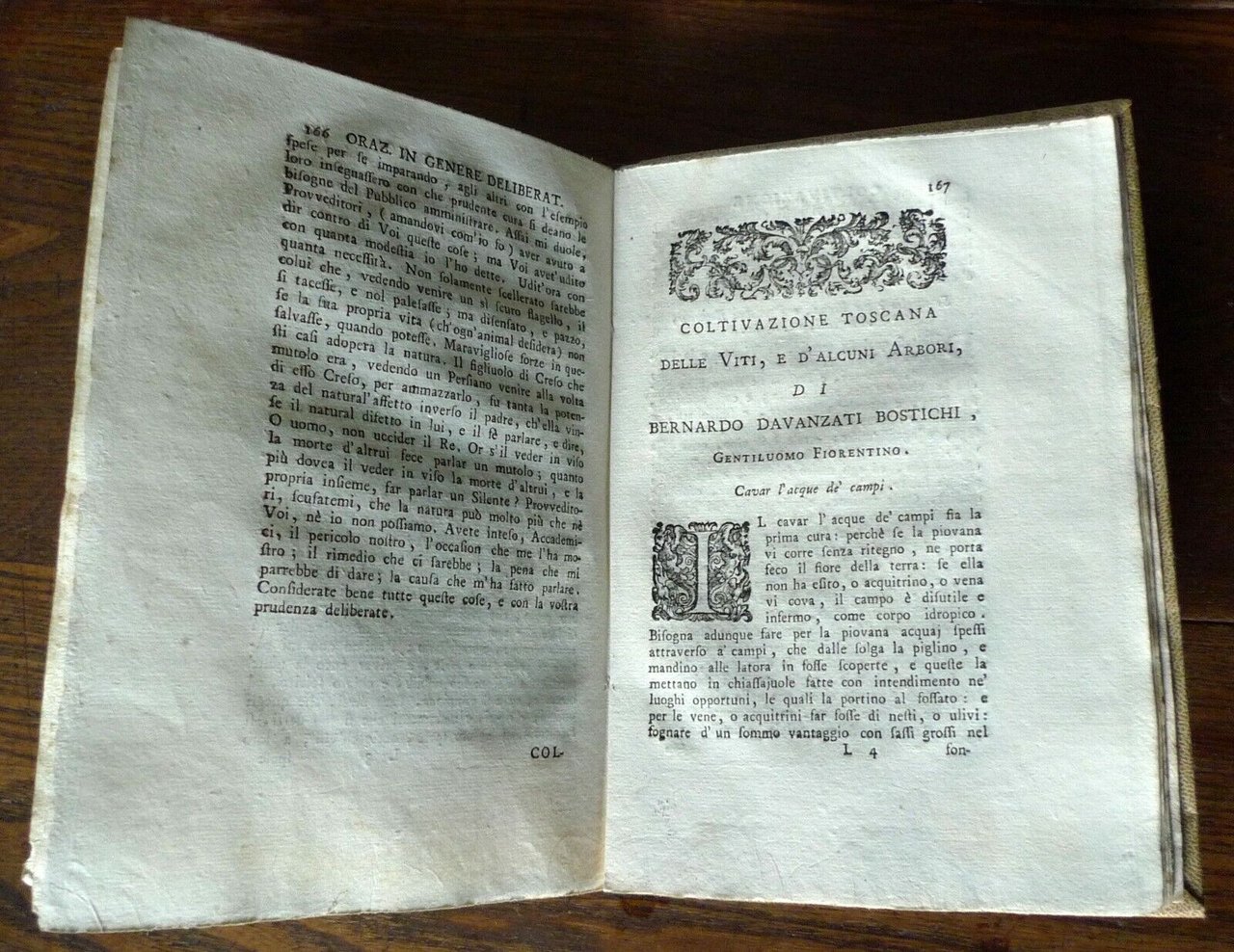 SCISMA D'INGHILTERRA CON ALTRE OPERETTE DEL SIGNOR BERNARDO DAVANZATI BOSTICHI, GENTILUOMO FIORENTINO;TRATTE DALL'EDIZION FIORENTINA DEL MDC.XXXVIII. CITATA DAGLI ACCADEMICI DELLA CRUSCA NEL LORO VOCABOLARIO; E ORA CON SOMMA DILIGENZA RIVEDUTE, E RICORRETTE. EDIZIONE II. AFFATTO SIMILE ALLA PRIMA.IN PADOVA, 1754, PRESSO GIUSEPPE COMINO,copertina morbida, rilegatura in pergamena,sovraccoperta in carta, 19,5x14 cm., pp.222,con un ritratto dell'Autore all'antiporta,una tavola ripiegata fuori testo,le OPERETTE comprendono:Notizia de' cambi, Lezione delle monete,Orazione in morte del Gran Duca Cosimo I.,Accusa data dal silente al travagliato,Orazione in genere deliberativo sopra i ProvveditoriDell'Accademia degli Alterati,Coltivazione Toscana delle viti, e d'alcuni arboripeso: g.260