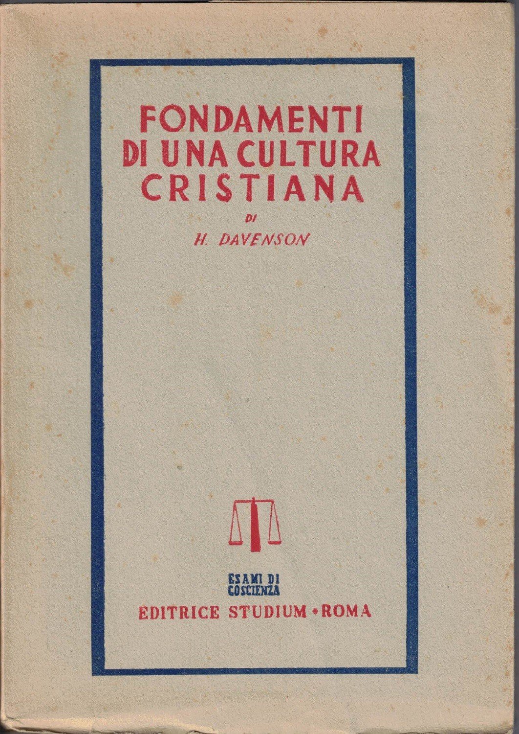 Henry Davenson, Fondamenti di una cultura cristiana, Editrice Studium, Roma 1948, pp. 171, cm 19, br. ed. con alette. Collana Esami di coscienza. Titolo originale: Fondements d’une culture chrétienne. Traduzione di Giampietro Dore. Leggere tracce d’uso, minime fioriture, uniforme brunitura della carta, per il resto ottimo. Intonso.