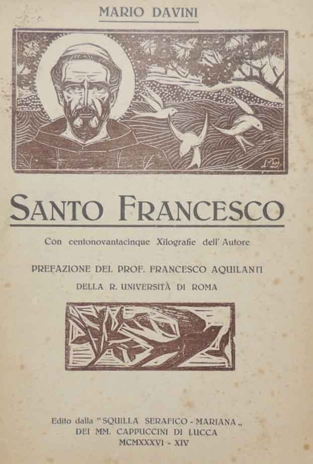 Mario Davini, Santo Francesco, con centonovantacinque xilografie dell’Autore, prefazione del prof. Francesco Aquilani della R. Università di Roma, Edito dalla Squilla Serafico-Mariana dei MM. Cappuccini di Lucca, Lucca 1936, pp. 248, ill. b.n. cm 25, br. ed. Al frontespizio, numero progressivo di classificazione. Due piccoli restauri al dorso, minime fioriture alla brossura, bella e uniforme brunitura della carta, per il resto buona copia ben conservata.