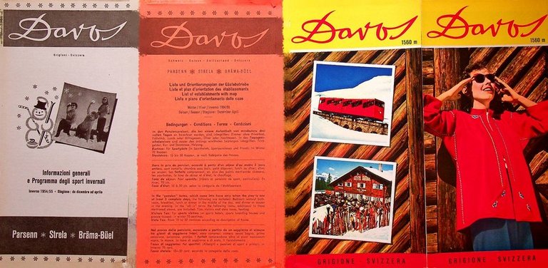 105x210 mm chiuso, 410x420 mm aperto. Condizioni : USATO - Stato : Buono, ordinari segni d'uso e del tempo. Altre note : Idea e progetto: Dürst/Hausamann - Fotografie: R. Capa, J. P. Caspar, W. Cohnitz, Comet, Conzett & Huber, O. Furter, J. Gaberell AG, L. Gensetter, M. Meerkämper, Swissair. \r\n Stampato in Svizzera nelle officine grafiche Conzett & Huber, Zurigo.\r\nIn allegato "Davos, informazioni generali del programma dello sport invernale, inverno 1954/55" e "Davos, piste e piano di orientamento delle case inverno 1954/55".