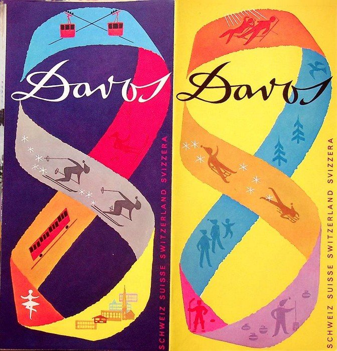 100x210 mm chiuso, 500x415 mm aperto. Condizioni : USATO - Stato : Buono, ordinari segni d'uso e del tempo. Altre note : Graphic: Hausamann. Stampato da Conzett & Huber, Zurich. In allegato "Davos: lista chiama l'orientamento delle case." e "Davos: programma degli sport invernali 1958/59".