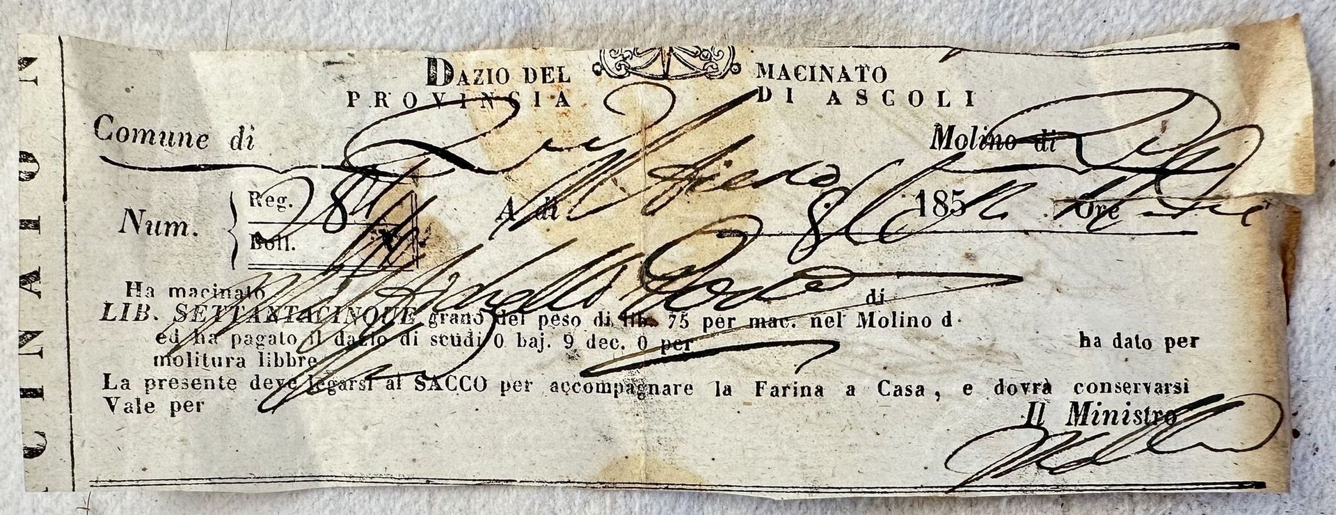 Rarissimo documento del 1850 circa, la ricevuta per il dazio del macinato per un comune della provincia di Ascoli Piceno. "La presente deve legarsi al Sacco per accompagnare la farina a casa e dovrà conservarsi". Note manoscritte al verso. Dim. mm 53x155Very scarce document of 1850 circa, the receipt of the tax for milled grains for a comune of the province of Ascoli Piceno. "La presente deve legarsi al Sacco per accompagnare la farina a casa e dovrà conservarsi". Handwritten notes in the verso. Dim. mm 53x155