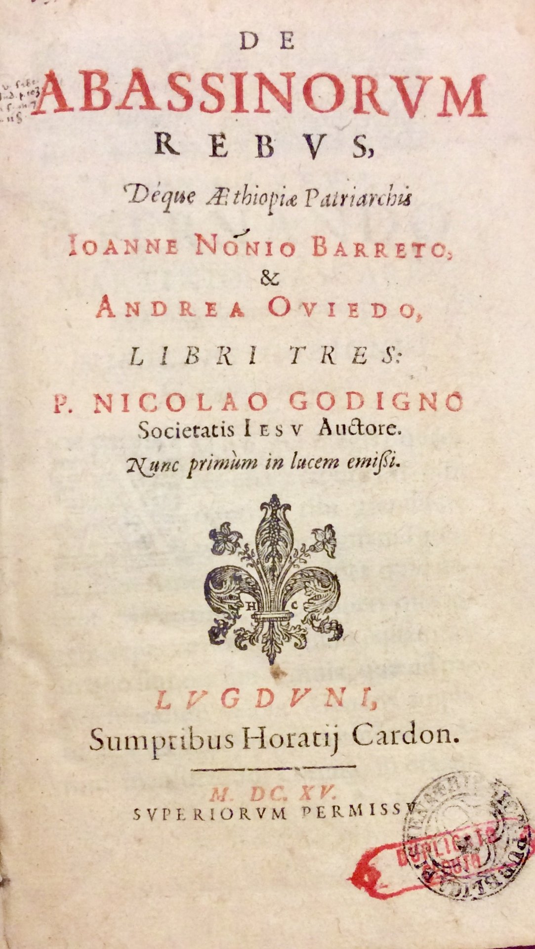 DE ABASSINORUM REBUS, DÉQUE AETHIOPIAE PATRIARCHIS IOANNE NONIO BARRETO, & ANDREA OVIEDO. - Libri Tres: P. Nicolao Godigno, Societatis Iesu Auctore. Nunc primum in lucem emissi.