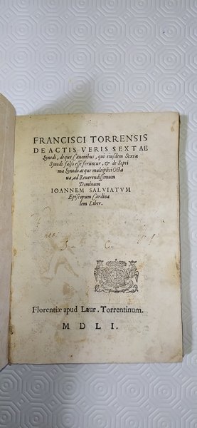 [500' TORRENTINO] (cm.20,5) ottima piena pergamena originale, titolo al dorso.-- pp. 101 + 1p. nn. + 1 carta con l' errata e bianca al verso. L' indice Ë al verso del frontis. Rara edizione originale dedicata a Giovanni Salviati. E la terza parte, a se stante, separatamente citata dal MORENI e l' unica che porta data e tipografia, poichË le due precedenti: "De summi ponteficis" e "De resistentia." sono prive di dati tipografici (Cfr. MORENI pp. 187/188). Vecchio restauro al margine di p.5 che intacca il testo, altrimenti esemplare bello e nitido con antico ex libris nobiliare al frontis. MORENI p.189; BM.STC. 687; ADAMS T1192.[f30]