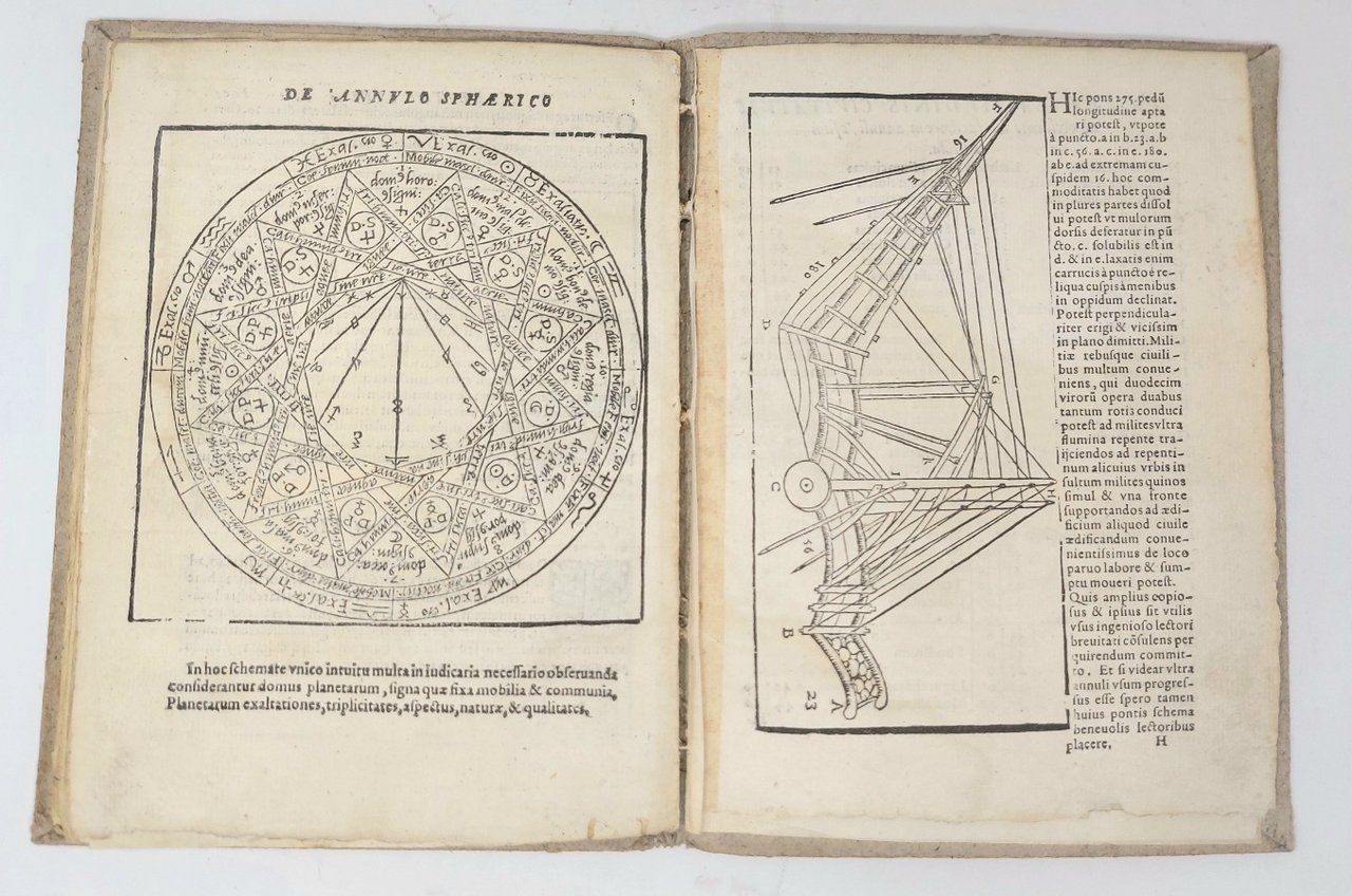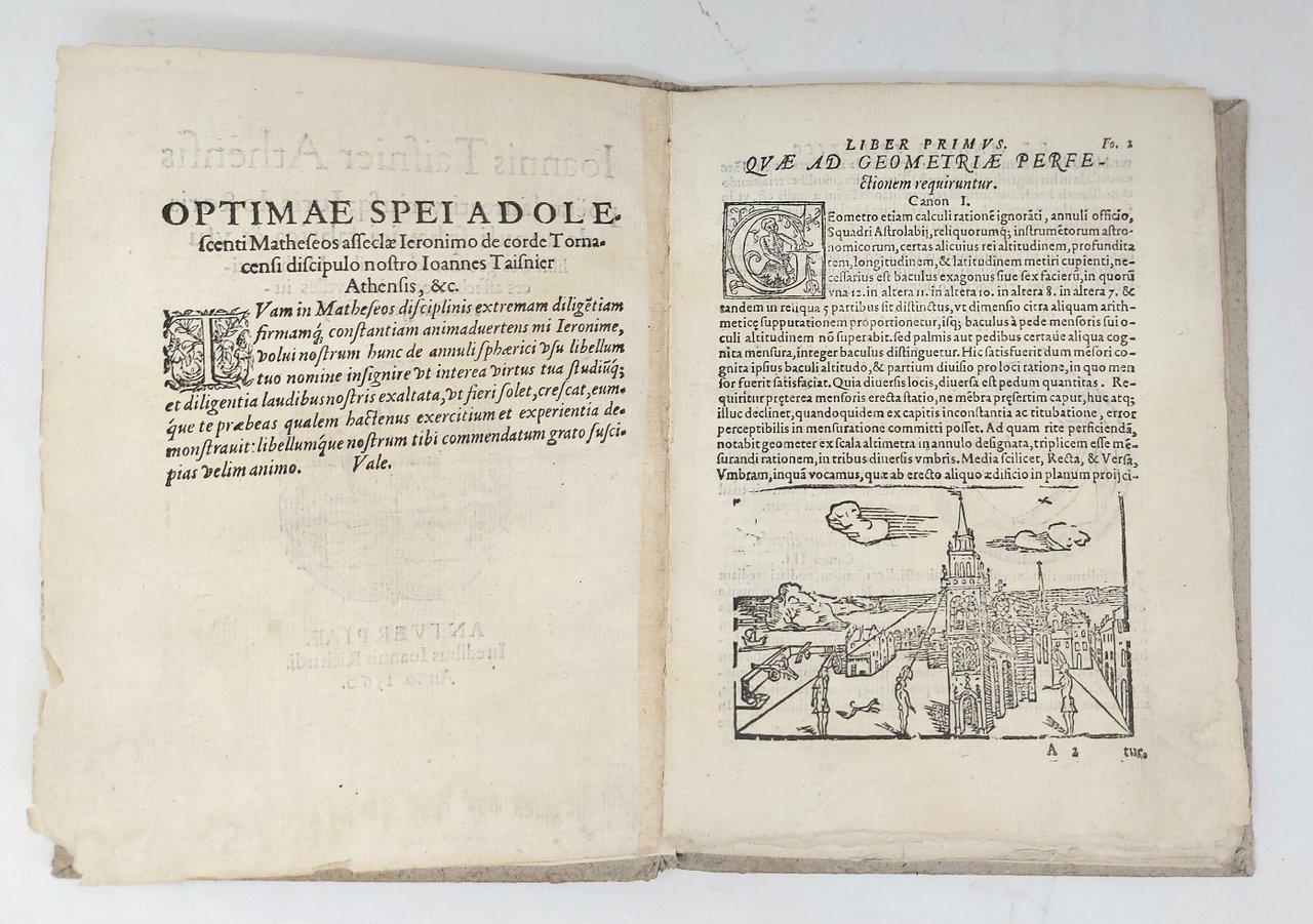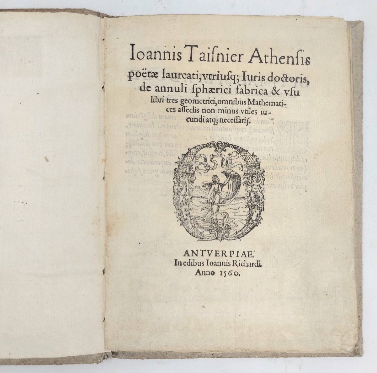 >in-4, ff. 27 (i.e. 26: ripetuto f. 24), (3, manca ultimo bianco), segn. A-H4, leg. antica in cartone rustico, tit. manoscritto al dorso. Al titolo grande impresa dello stampatore raffigurante l'allegoria della fortuna; numerose iniziali istoriate e varie figure xilografiche n.t. di strumenti per la misurazione delle distanze e i vari casi in cui si possono utilizzare. Seconda edizione, la prima era apparsa nel 1550, dell'opera dell'illustre matematico (nato nel 1509), fisico, filosofo e musicista. Taisnier prese parte alla spedizione di Carlo V a Tunisi, insegnò matematica a Palermo, Roma e Ferrara e negli ultimi anni di vita fu maestro di musica presso l'arcivescovato di Colonia. Scrisse anche altre importanti opere concernenti la geometria ed il magnetismo. Interessante trattato, diviso in tre libri, sulle tecniche di misurazione; in fine tavola delle latitudini della città. Buon esempl. a pieni marg. (ex-libris Fumach). Adams T-68. Graesse VII, 22. STC 655 (prima ediz.). Houzeau-Lancaster 2546. Thorndike pp. 580-588.