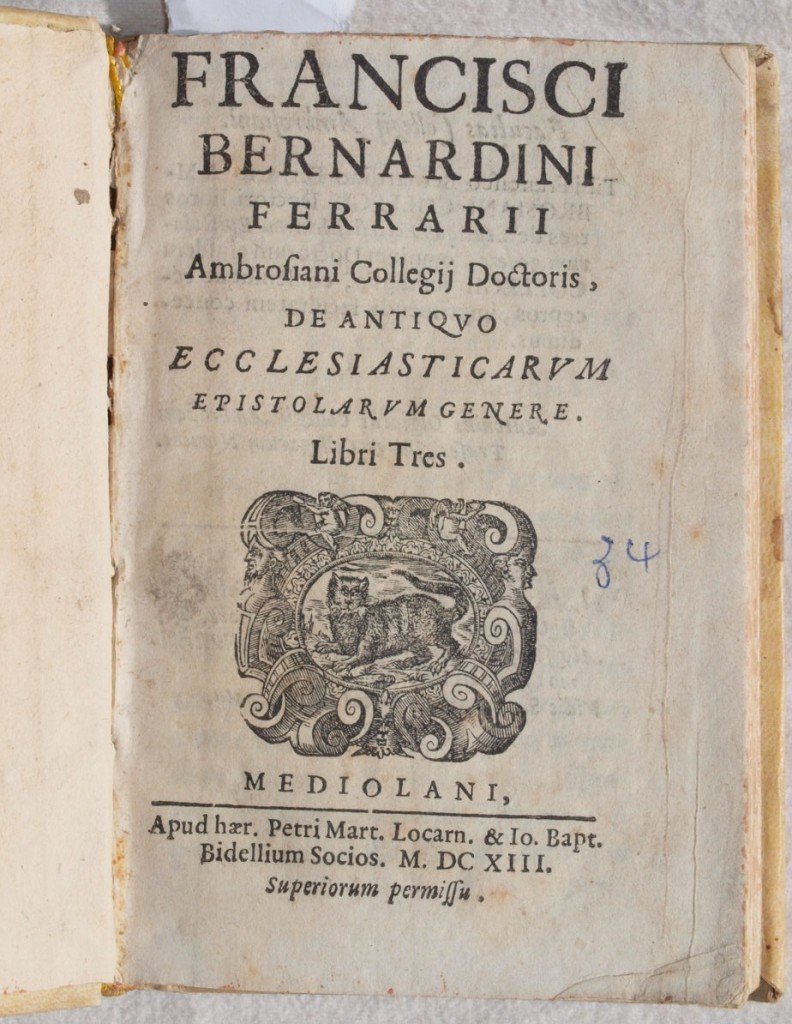 In 16. Dim. 16x11 cm. Pp. 16 (n.n.)+192+24 (n.n.). Prima edizione del 1613 di questa rarissima opera di Francesco Bernardino Ferrari (1577-1669), direttore della Biblioteca Ambrosiana. Nell'opera Ferrari descrive le antiche lettere ecclesiastiche (utilità, divisione, canociche, comunicatorie, dimissioni, pacifiche, trattatorie, encicliche, decretali, sinodi, confessori, privati, saluto ecc.). L'opera è in un volume collazionato e completo. Bella marca editoriale al frontespizio. Nota manoscritta a penna al frontespizio. In ottime condizioni. Copertina in piena pergamena in ottime condizioni generali con lievi usure ai margini e dorso; etichetta al piatto anteriore. Legatura in ottime condizioni. All'interno le pagine si presentano in ottime condizioni con rare fioriture. First edition of 1613 of this very scarce work written by Francesco Bernardino Ferrari (1577-1669), director of the Biblioteca Ambrosiana. In the work Ferrari describes the ancient ecclesiastic letters (useful, division, canocical, comunicatory, dimissions, pacific, decrees, sinodes, confessors, privates, greetings etc.). The work is in one volume collationed and complete. Beautiful editorial mark in the title page. Manuscripted note with pen in the title page. In very good conditions. Full parchment cover in very good general conditions slightly worn in the edges and spine; label in the front plate. Binding in very good conditions. Inside pages are in very good conditions with occasional foxings.