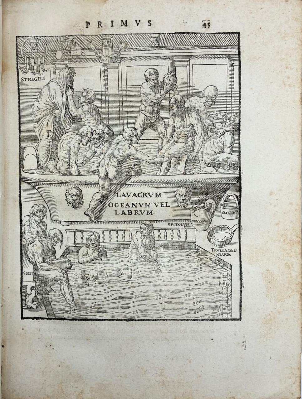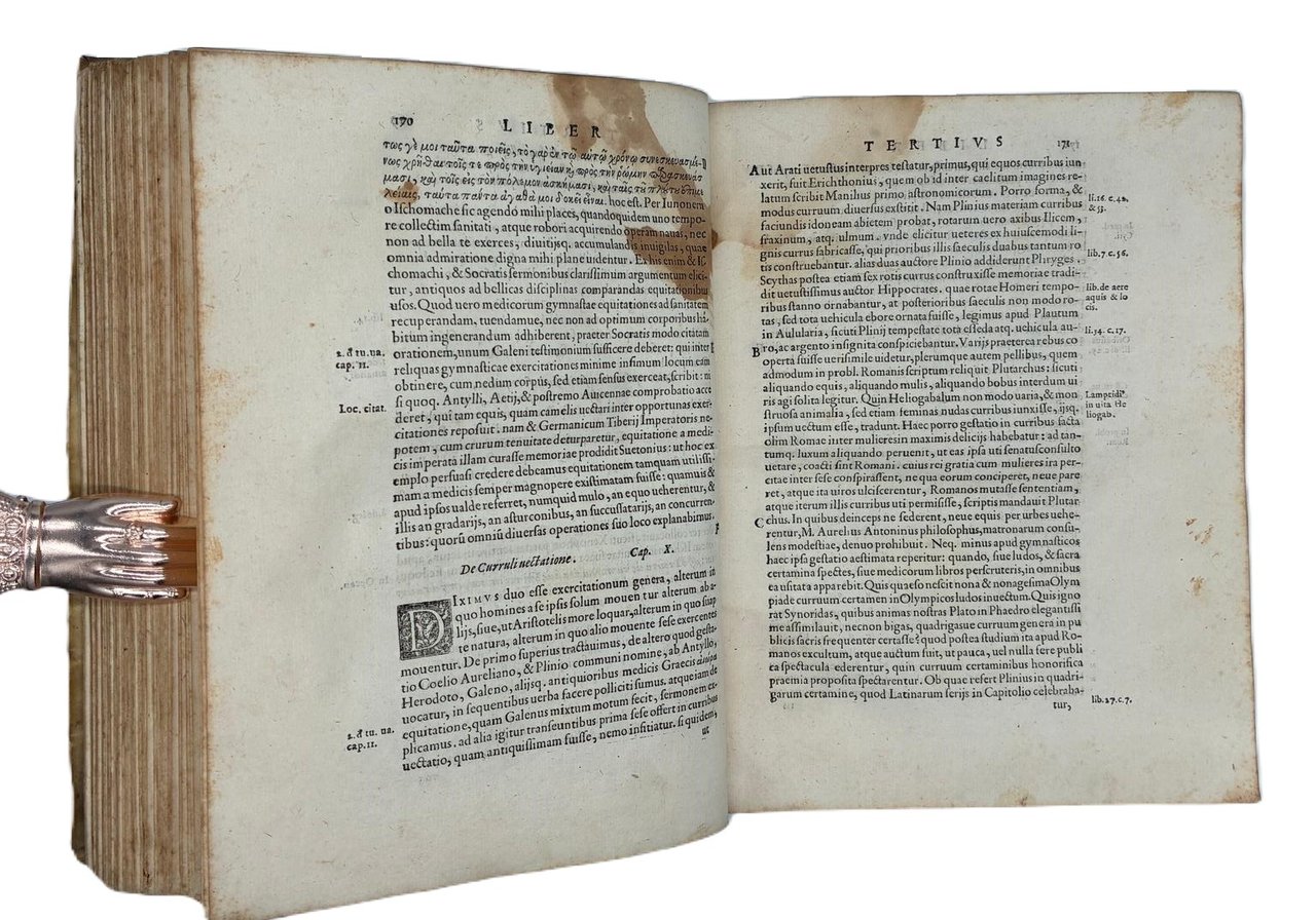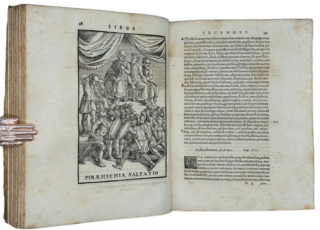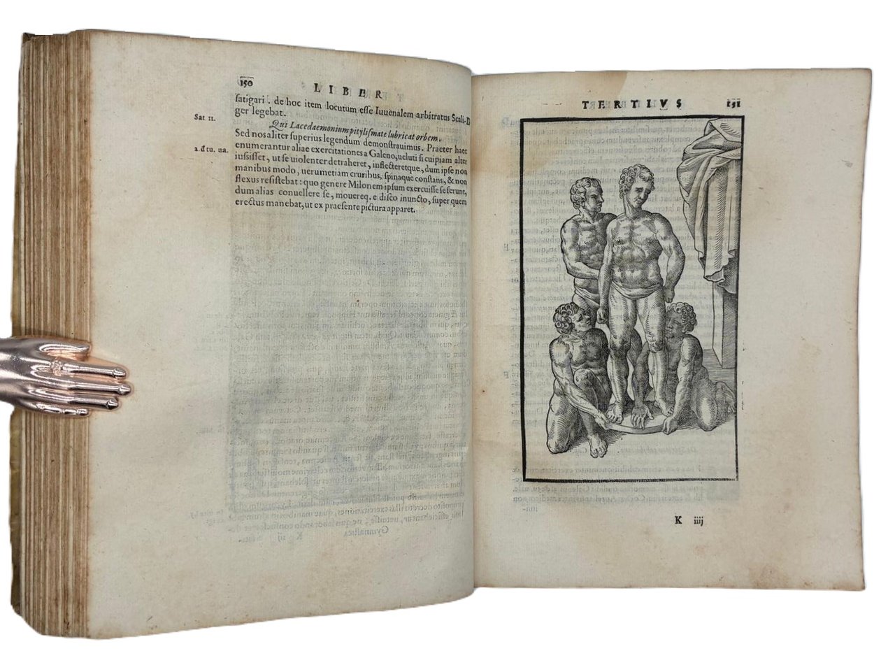 In 4° (240 x 180 mm); [12], 308 [ma 312], [28] pagine. Marca tipografica al frontespizio e al colophon, capilettera decorati e 24 figure xilografiche, in gran parte a piena pagina (21 + le 2 piante della palestra + la figura del "circulus" a pag. 166) disegnate dal pittore, architetto e antiquario Pirro Ligorio e intagliate da Cristoforo Coriolani. Macchia al margine bianco del frontespizio, occasionali macchie da sfoglio, talvolta brunito, vecchio ma persistente alone nella parte superiore, talvolta piu evidente all'inizio ed alla fine del volume. Macchie piu scure alle pagine 131-132 e 168-171 (vedi foto).