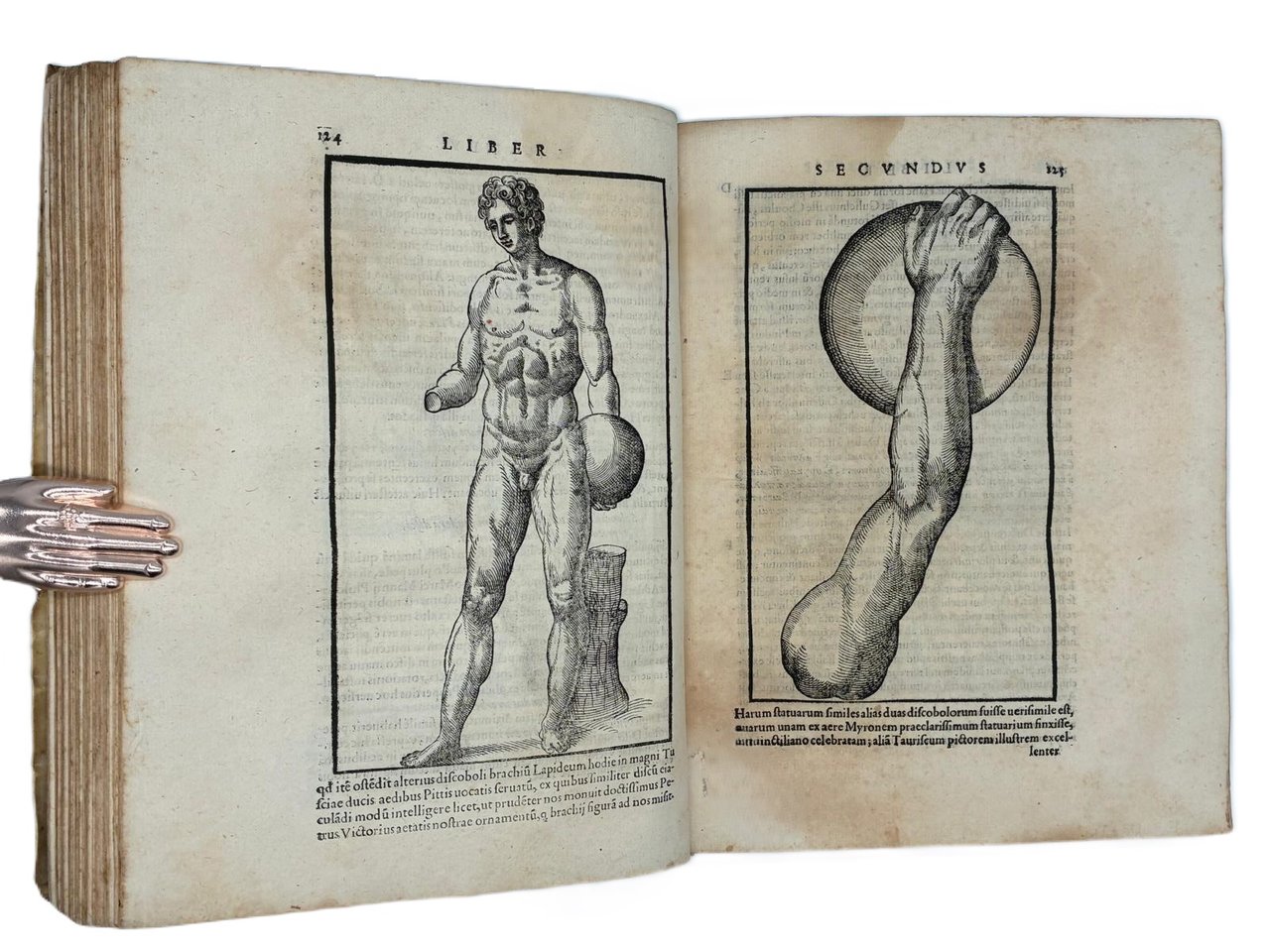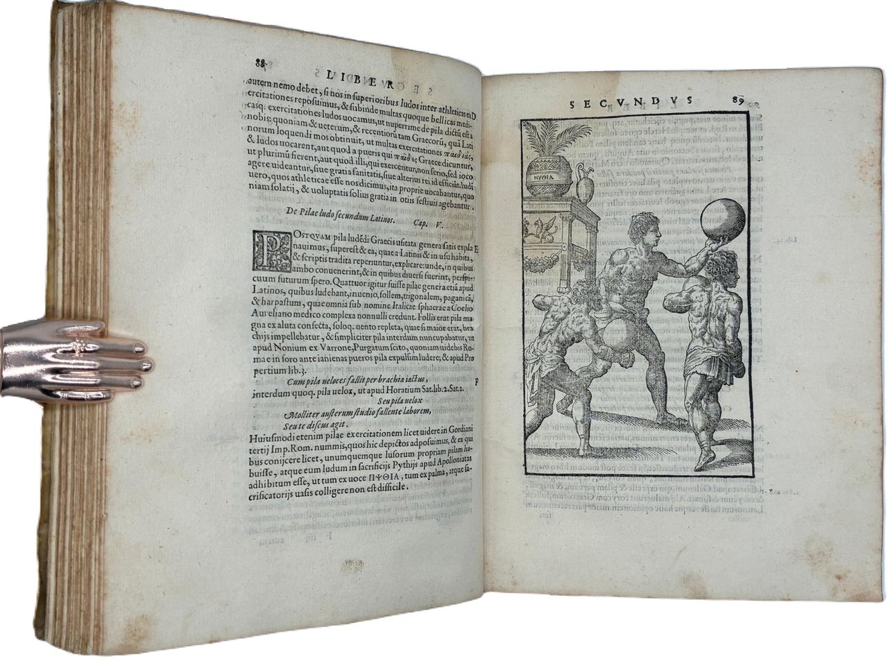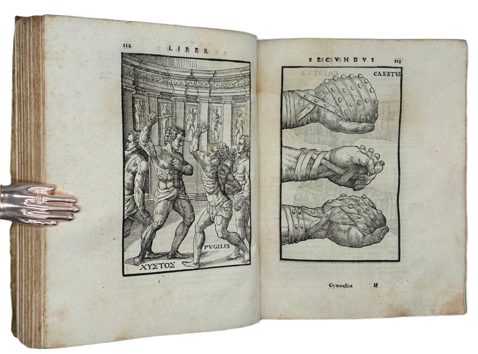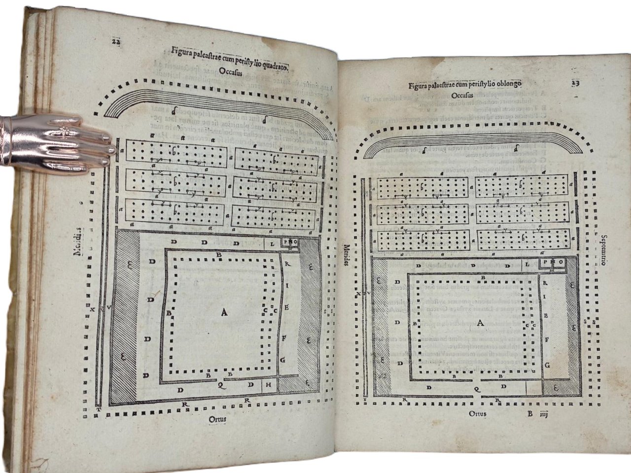 In 4° (240 x 180 mm); [12], 308 [ma 312], [28] pagine. Marca tipografica al frontespizio e al colophon, capilettera decorati e 24 figure xilografiche, in gran parte a piena pagina (21 + le 2 piante della palestra + la figura del "circulus" a pag. 166) disegnate dal pittore, architetto e antiquario Pirro Ligorio e intagliate da Cristoforo Coriolani. Macchia al margine bianco del frontespizio, occasionali macchie da sfoglio, talvolta brunito, vecchio ma persistente alone nella parte superiore, talvolta piu evidente all'inizio ed alla fine del volume. Macchie piu scure alle pagine 131-132 e 168-171 (vedi foto).