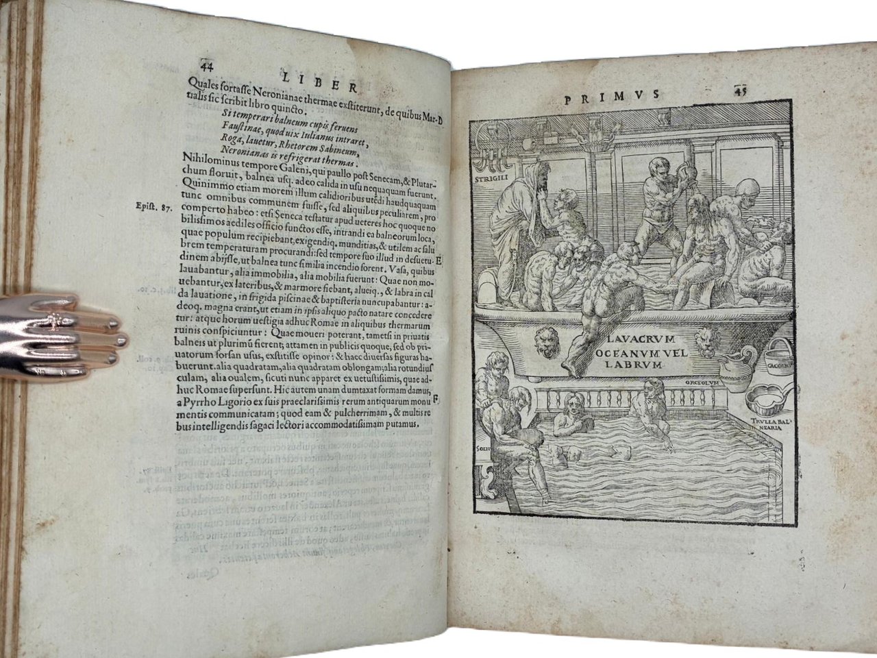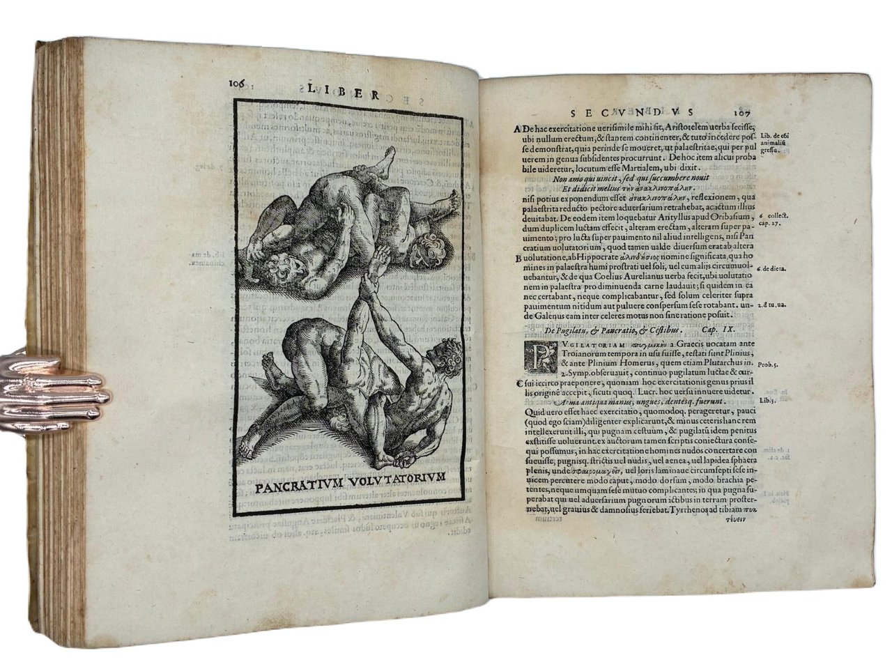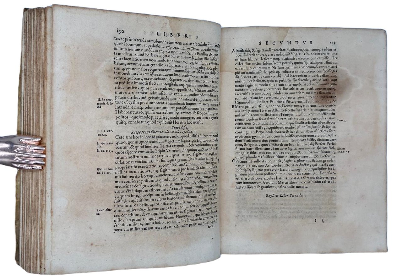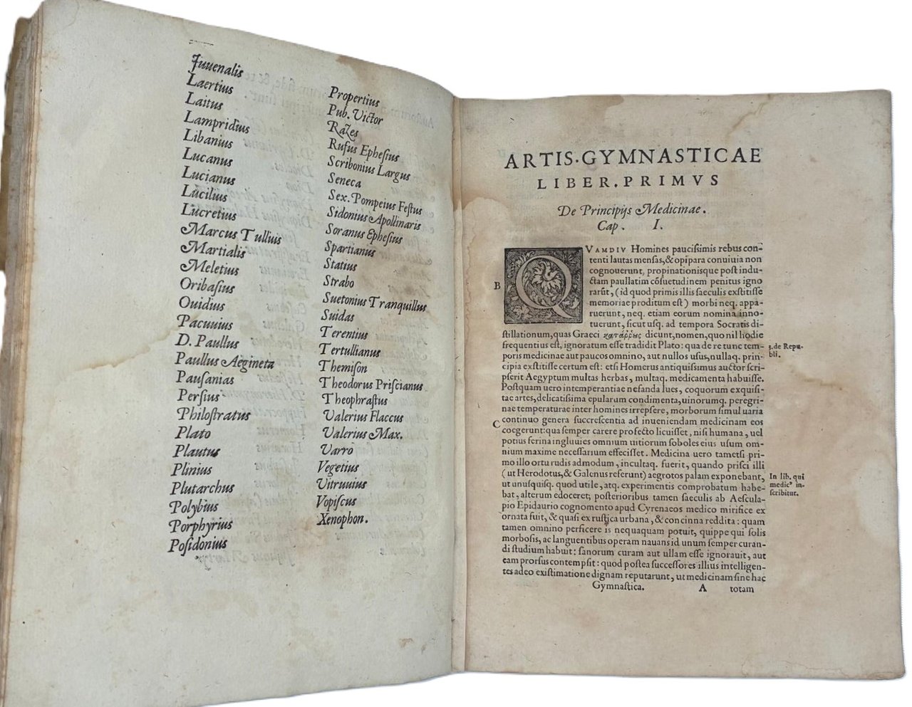 In 4° (240 x 180 mm); [12], 308 [ma 312], [28] pagine. Marca tipografica al frontespizio e al colophon, capilettera decorati e 24 figure xilografiche, in gran parte a piena pagina (21 + le 2 piante della palestra + la figura del "circulus" a pag. 166) disegnate dal pittore, architetto e antiquario Pirro Ligorio e intagliate da Cristoforo Coriolani. Macchia al margine bianco del frontespizio, occasionali macchie da sfoglio, talvolta brunito, vecchio ma persistente alone nella parte superiore, talvolta piu evidente all'inizio ed alla fine del volume. Macchie piu scure alle pagine 131-132 e 168-171 (vedi foto).