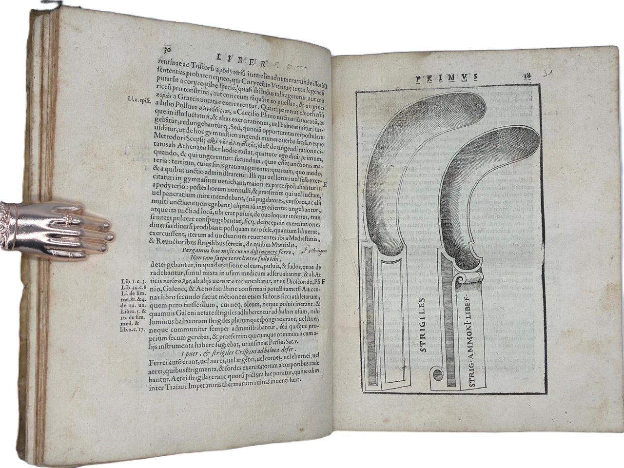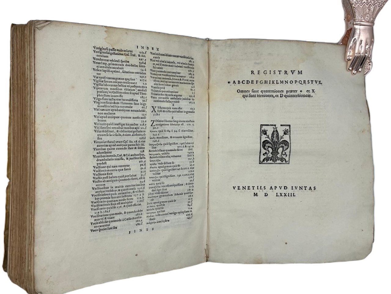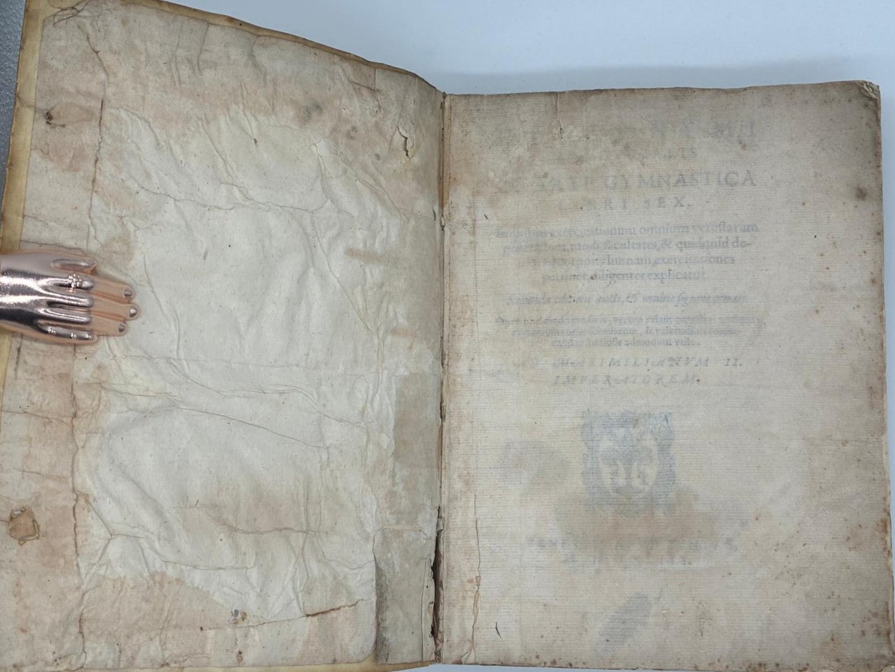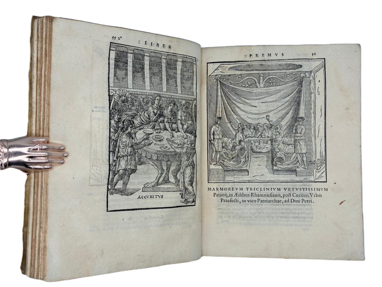 In 4° (240 x 180 mm); [12], 308 [ma 312], [28] pagine. Marca tipografica al frontespizio e al colophon, capilettera decorati e 24 figure xilografiche, in gran parte a piena pagina (21 + le 2 piante della palestra + la figura del "circulus" a pag. 166) disegnate dal pittore, architetto e antiquario Pirro Ligorio e intagliate da Cristoforo Coriolani. Macchia al margine bianco del frontespizio, occasionali macchie da sfoglio, talvolta brunito, vecchio ma persistente alone nella parte superiore, talvolta piu evidente all'inizio ed alla fine del volume. Macchie piu scure alle pagine 131-132 e 168-171 (vedi foto).