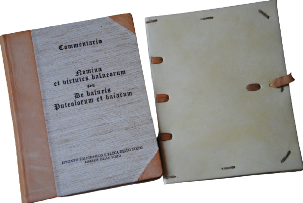 De Balneis Puteolanis. Pietro da Eboli. Codice Angelico 1474 (Nomina et Virtutes Balneorum sev de Balneis Puteolorum et Baiarum. Autore Petrus De Ebulo. Biblioteca Angelica, Roma, Ms. 1474. Istituto Poligrafico dello Stato, Roma, 1962. Composto tra il 1212 e il 1221 a Napoli contiene una descrizione delle terme di Pozzuoli e Baia e ne elogia le virtù terapeutiche. Opera dedicata a Federico II da Pietro da Eboli. Due volumi : il facsimile (16x20 cm. Fogli 26) con all’interno 18 miniature con il testo sul retro, intervallate da carta pergamina trasparente. Legatura in piena pergamena il commentario (pagine 97) a cura di Angela Daneu Lattanzi, in italiano. Tiratura limitata a 1200 copie. Condizioni ottime.