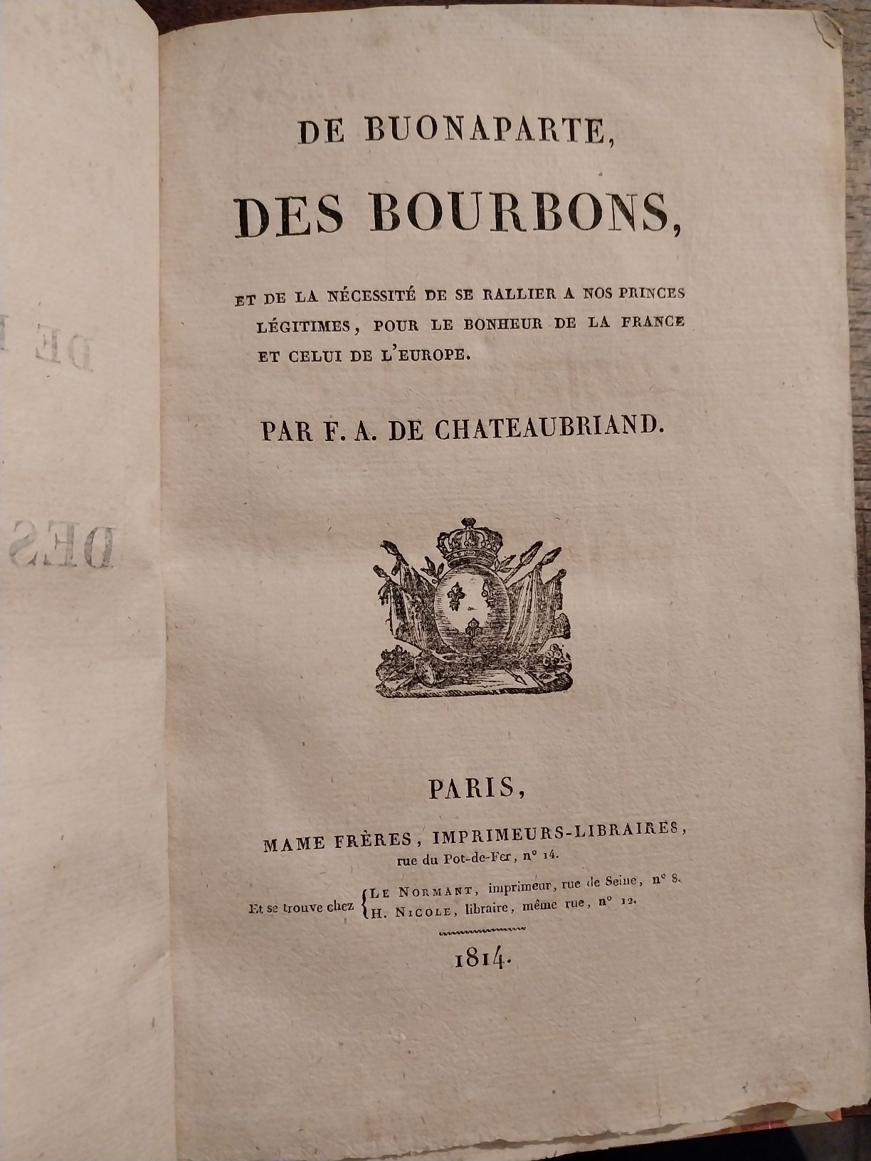 In-8°, pp. (6), 87, cartonatura moderna. Esemplare in barbe. Virulento pamphlet che l'autore cominciò a scrivere alla fine del 1813 o all'inizio del 1814, e fu stampato nell'aprile dei 1814, probabilmente il 5 del mese, tre giorni dopo la destituzione di Napoleone, proclamata dal senato parigino. I passaggi più brillanti sono quelli non dedicati a difendere i Borboni ma a distruggere l'imperatore definito 'usurpateur et étranger' .