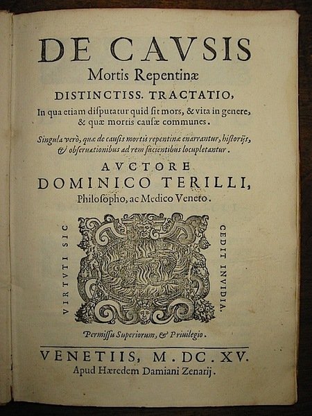 4to (cm. 21,9), 8 cc.nn., 118 pp., 1 c.nn. (bianca). Marca tipografica al frontis, capilettera e fregi xilografici n.t. Legatura coeva in piena pergamena floscia con titolo ms. al ds. Nota anticamente ms. sulla carta di guardia libera anteriore. Restauro marginale al piatto posteriore, qualche lieve traccia d’usura e piccole mancanze al ds. Ottimi interni, assai freschi. Questo saggio è una tra le prime opere in Europa dedicata al problema delle cause di morte improvvisa naturale. Edizione originale, rara. Krivatsy, 11757; Br.Libr., p. 899.