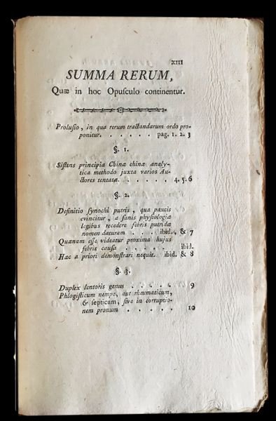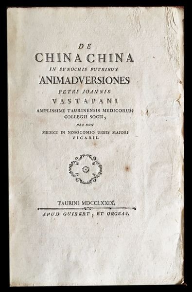 In 8° (21,5x13,7 cm); XXXI, (1), 152, (2) pp. e una c. di tav. fuori testo. Bella brossura editoriale coeva a motivi a colori, qualche difetto al dorso. Esemplare ancora in barbe. Bel ritratto di Vittorio Amedeo III Re di Sardegna fuori testo. Prima edizione del noto medico torinese di questo studio medico farmaceutico dedicato all'utilizzo della corteccia peruviana nella cura delle febbri tifoidee e putride. L'autore descrive vari casi clinici trattati con vari preparati a base di distillati della corteccia peruviana. Scrive Bonino, II, pp. 529-532 "Assunto nel 1765 a medico assistente nello spedale di s. Giovanni, stampa nel 1779 una dissertazione, nella quale dopo di aver dimostrato, anche con l'autorità di sommi clinici, quanto dannevole fosse la pratica di coloro, i quali ravvisando nel cortice peruviano un antisettico potentissimo, a questo rimedio avevano ricorso indistintamente in ogni caso di sinoco così detto putrido, imprende ad indicare da quel sagace clinico ch'egli era, le circostanze in cui il cortice può realmente tornar vantaggioso in quelle febbri, cui egli però negava fin d'allora convenirsi l'epiteto di putride". Vastapane nacque a Riva di Chieri nel 173 e morì a Torino nel 1819. Aggregato al Collegio Medico di Torino dal 1767, fu medico di corte dal 1784. Nel 1787 ottenne limportante carica di professore onorario di medicina. Nel 1790 divenne consigliere straordinario nel magistrato del Protomedicato. Opera in buone-ottime condizioni di conservazione ed ancora in barbe. Non comune. Rif. Bibl.: De Renzi, V, pp. 659 e p. 576. Blake, p. 469.