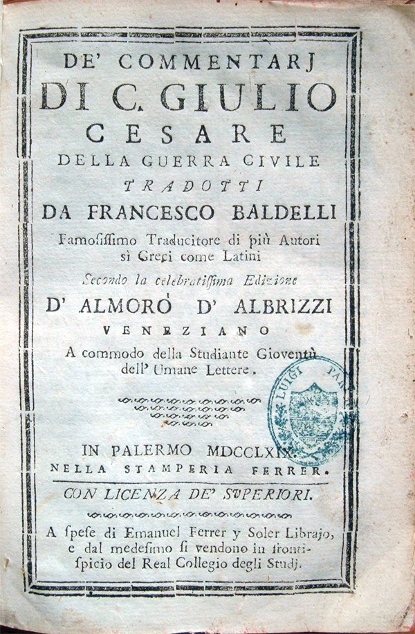 De' commentarj di C. Giulio Cesare della guerra civile tradotti da Francesco Baldelli, famosissimo traduttore di più autori sì Greci come Latini, secondo la celebratissima edizione d'Almorò d'Albrizzi veneziano, a commodo della studiante gioventù