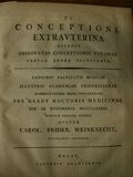 DE CONCEPTIONE EXTRAUTERINA. Accedit OBSERVATIONE CONCEPTIONIS TUBARIAE tabula aenea illustrata. Consensu Facultatis Medicae illustris Academiae Fridericianae dissertationem hanc inauguralem pro gradu Doctoris Medicinae.