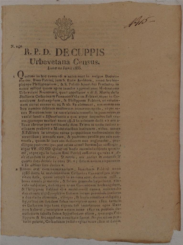 In 4. Dim. 29x22 cm. Pp. (4). Interessante pubblicazione del 1835, una sentenza del Tribunale della Sacra Rota del 22 Giugno 1835 per una causa nella diocesi di Orvieto. Si tratta della causa per il censo ottenuto da Caterina Pannucci vedova Fabiani e Filippo Fabiani che ottennero un censo di 24 scudi per pagare il debito con il Nosocomio di Orvieto per il possesso del terreno "Il Quartuccio". In buone condizioni. Copertina assente. Legatura assente. All'interno le pagine si presentano in buone condizioni con rare fioriture. Interesting pamphlet of 1835, a sentence of the Trial of Sacra Rota for a trial of 22nd of June 1835 in the diocesis of Orvieto. It is the trial for the census obtained by Caterina Pannucci vow Fabiani and Filippo Fabiani who obtained a census of 24 scudi to pay the debt with Nosocomio of Orvieto for the owning of the land "Il Quartuccio".<BR>In good conditions. Cover is missing. Binding is missing. Inside pages are in good conditions with foxings and yellowings.
