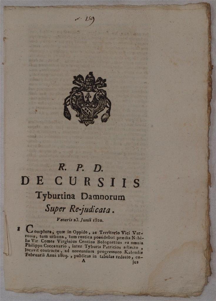 In 4. Dim. 29,5x21 cm. Pp. (7). Interessante pubblicazione del 1820, una sentenza del Tribunale della Sacra Rota del 23 Giugno 1820 per una causa nella diocesi di Tiburtina. Si tratta della sentenza per il contratto di alcune proprietà nel territorio Vici Varroni possedute dal nobile Virginio Cencio Bolognetto stipulato con Filippo Coccanario. Quest'ultimo doveva gestire tutte le proprietà. In buone condizioni. Copertina assente. Legatura assente. All'interno le pagine si presentano in buone condizioni con fioriture e bruniture. Usure ai margini. Interesting pamphlet of 1820, a sentence of the Trial of Sacra Rota for a trial of 23rd of June 1820 in the diocesis of Tiburtina. It is the trial for the contract with Filippo Coccanario for some properties in the land Vici Varroni owned by the nobleman Virginio Cencio Bolognetto. Coccanario had to manage all properties. In good conditions. Cover is missing. Binding is missing. Inside pages are in good conditions with foxings and yellowings. Worn edges.