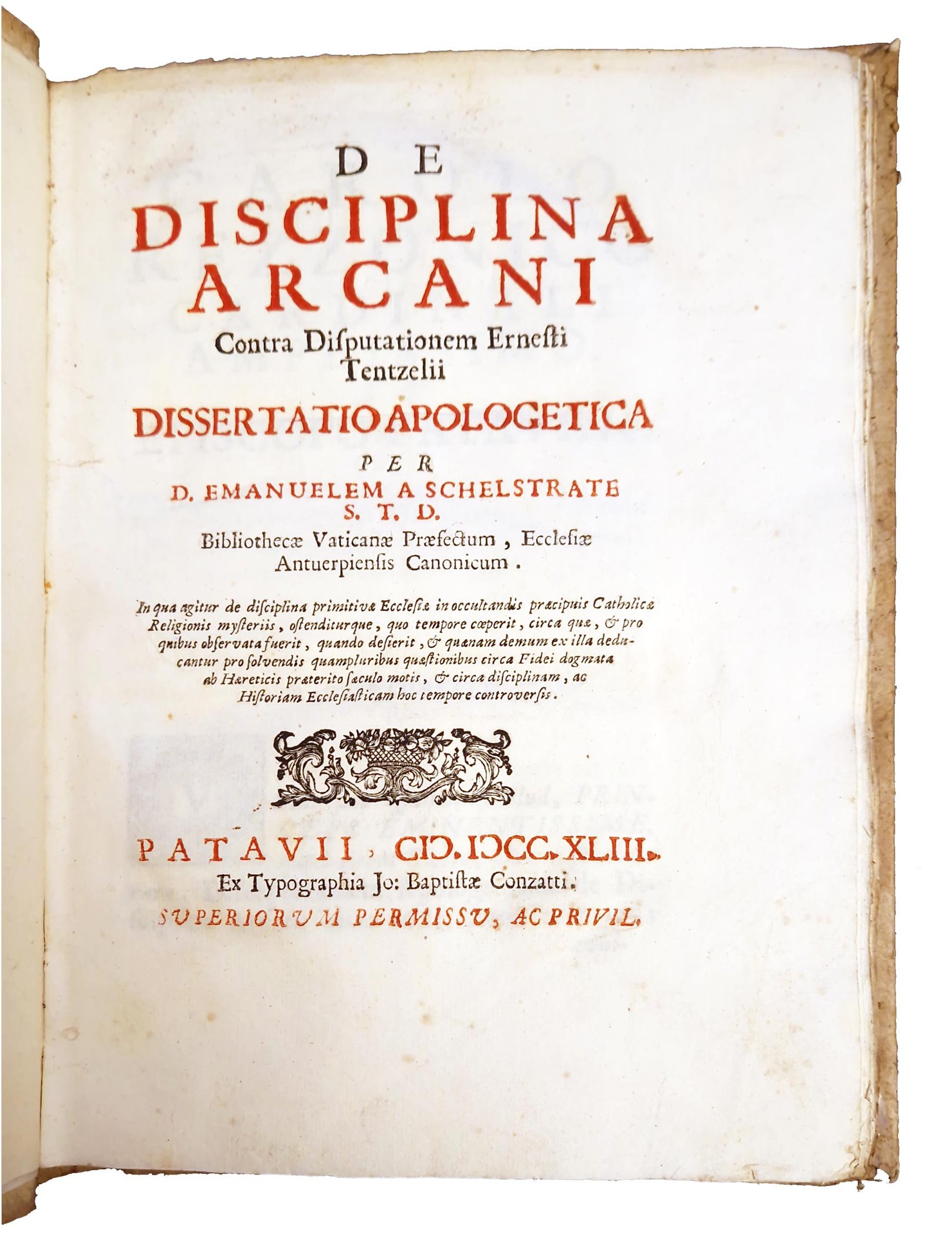 De disciplina arcani contra disputationem Ernesti Tentzelii dissertatio apologetica per d. Emanuelem a Schelstrate S.T.D. Bibliothecae Vaticanae praefectum […]. In qua agitur de disciplina pimitivae Ecclesiae in occultandis praecipuis catholicae e religionis mysteriis, […].