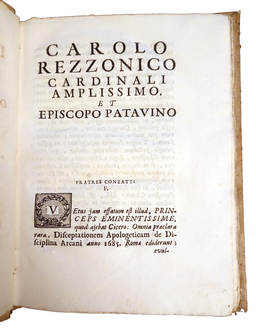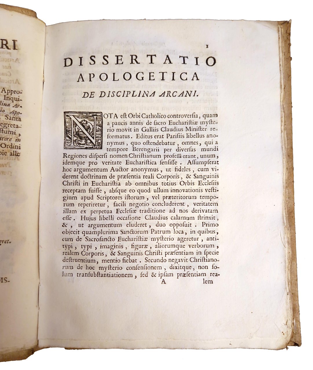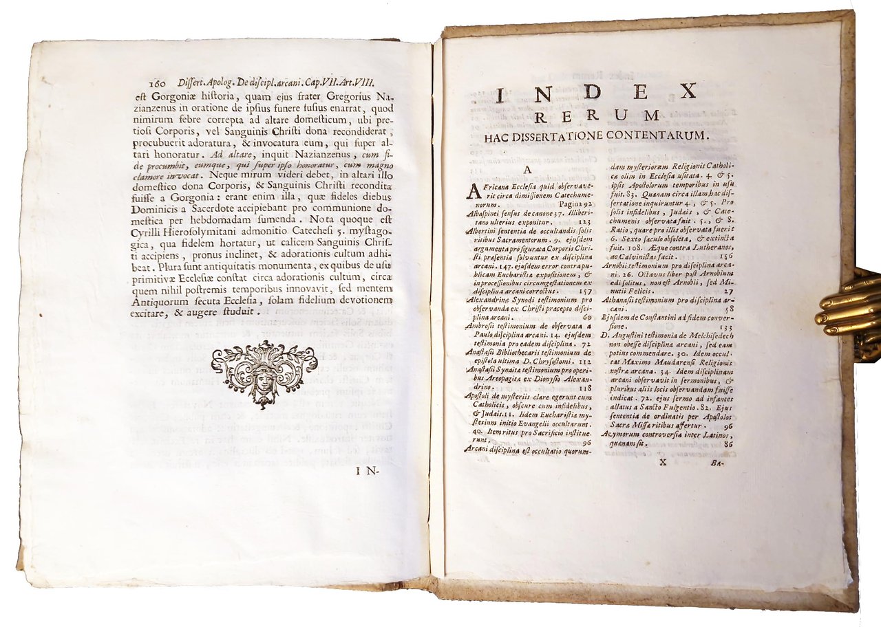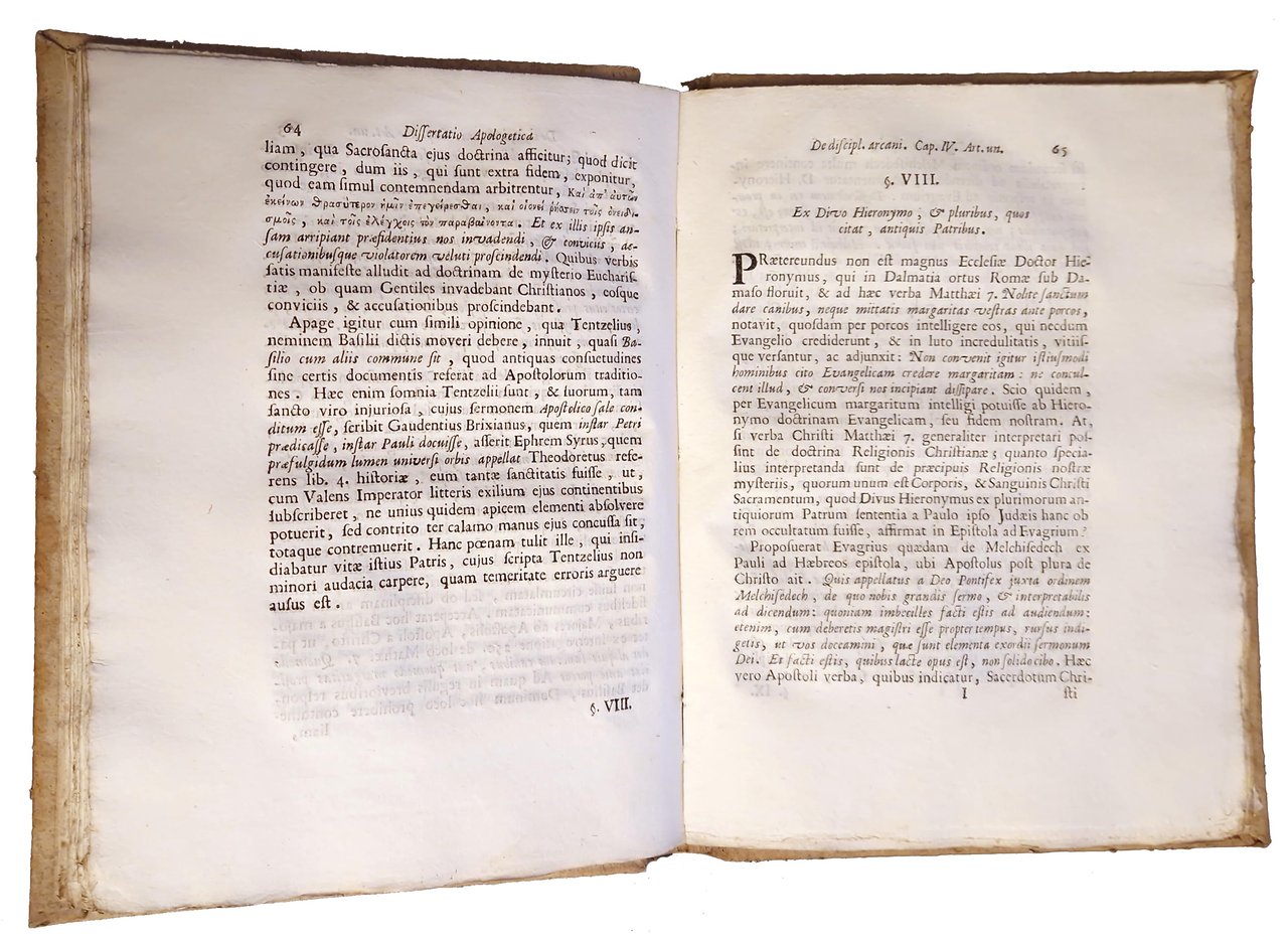 in-4°, 258x192 mm, leg. coeva in cartonato grezzo muto, titolo manoscritto al dorso; pp. [16], 160, [8]; frontespizio stampato in rosso e nero; fregio xil. sul frontespizio; iniziali xilografiche. Seconda edizione (la prima fu pubblicata a Roma nel 1685) di questa dissertazione teologica a cura di Emmanuel Schelstrate in risposta alla confutazione del luterano Wilhelm Ernst della sua "Disciplina arcani", un libro pubblicato nel 1685 che tratta della "Disciplina del Segreto" o "Disciplina dell'Arcano", un'usanza prevalente nel cristianesimo primitivo, per cui la conoscenza dei misteri più intimi della religione cristiana era accuratamente custodita dai non cristiani e anche da coloro che si stavano istruendo nella fede. Emmanuel Schelstrate (1649-1692) era un teologo cattolico; mentre era canonico della cattedrale di Anversa, fu chiamato a Roma da papa Innocenzo IX e nominato assistente bibliotecario della Biblioteca Vaticana; fu un fine studioso della prima storia ecclesiastica e divenne il difensore accreditato della supremazia papale. Rif.: IT\ICCU\RMLE\019049. OCLC, 1040761136. Cond.: Lievi tracce d'uso alla legatura (presenza di macchie sui bordi dei piatti). Legatura solida. Carte pulite, croccanti, in barbe; testo marginoso. Esemplare molto buono.
