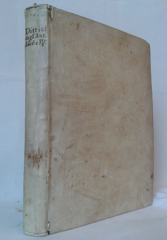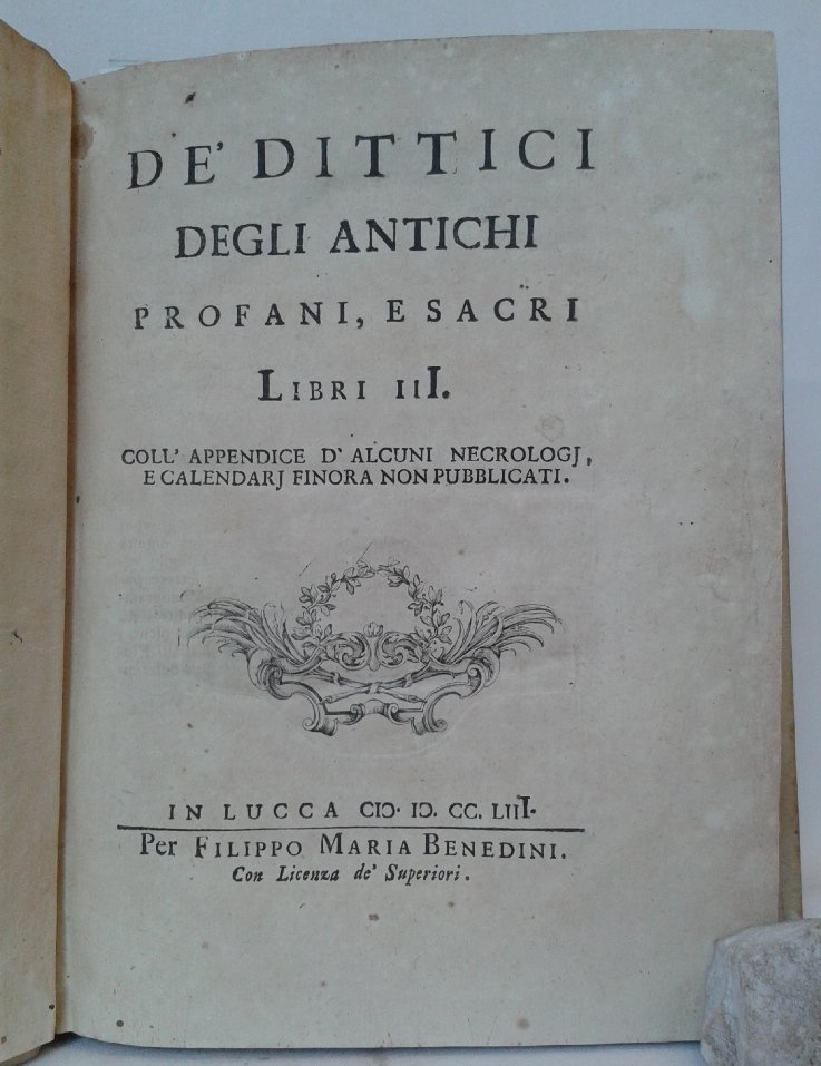 Volume in 4 antico, legatura coeva in piena pergamena, titolo manoscritto al dorso, sguardie (antica firma a pennino), frontespizio con bella marca tipografica lucchese, ampia dedicatoria al principe Querini, prefazione dell'autore, sommario, XXXII, 491 pp., errata. Quattro tavole ft. (su sei) di cui due grandi ripiegate. Opera davvero particolare ed interessante questa dell'abate ed archeologo lucchese, prende spunto da alcune osservazioni dell'autore sopra un Dittico d'avorio del 506 all'epoca rinvenuto in Lucca, unendo in questo compendio tutte le notizie, alcune riprese da vari e autorevoli autori, sull'argomento. La prima parte dell'opera a carattere storiografico e tratta i Dittici in genere con un interessante disanima su alcune specifiche, come ad esempio, sulle materie adoperate per formare i Caratteri, con una succinta notizia di tutte quelle materie su cui un tempo scrissero gli Ebrei, gli Egizi, gli Etruschi, i Greci ed i Latini, ricercandone l'invenzione, l'uso e la durata, con l'indicazione di alcuni ritrovamenti, oppure sulla diversa Forma dei Libri antichi e dei molti e diversi nomi che furono loro dati, ancora sulle diverse specie di dittici e loro vario e differente uso, con la spiegazione degli strumenti usati per formare e sugellare i caratteri, sull'origine dei Calendari, dei Martirologi e delle Canonizzazioni da' Dittici; la seconda parte tratta dei dittici in particolare, prendendone in esame pi di venticinque; mentre nella terza parte l'autore spiega alcuni Dittici e Trittici qui pubblicati per la prima volta, di cui molti conservati in Lucca. A completare l'opera un appendice su alcuni Necrologi e Calendari inediti. Splendida edizione originale, corredata di note e notizie bibliografiche, stampata a grandi margini su carta greve. Un vero peccato la mancanza delle due tavole, ma l'opera resta di indubbio valore ed interesse. In ottimo stato di conservazione.