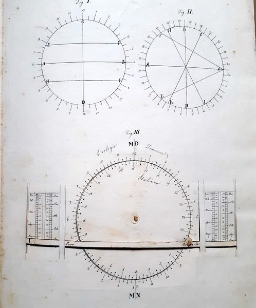 In-folio, 22cc; 20cc; 32cc; 8cc; manoscritto, completo di tre figure con orologio esemplificatore a parti mobili per la conversione da ore francesi in italiane. Buone condizioni, legatura in mezza pelle.Della vasta produzione di Cagnoli sull’argomento dell’astronomia si può ricordare la dissertazione Degli inconvenienti che nascono dal regolare gli orologi al tramontar del sole, o come anche dicesi all'italiana (stampata in opuscolo a Venezia nel 1787), che si occupa delle difficoltà nascenti dal regolare gli orologi su fenomeni che si verificano a ore diverse nei vari periodi dell'anno, come avviene per l'alba o il tramonto.In-4 °, 22cc; 20cc; 32cc; 8cc; manuscript, half claf binding, complete with three figures with exemplary clock for the conversion from French to Italian hours. Good condition, binding in hardcover. Of the vast production of Cagnoli on the subject of astronomy we can remember the dissertation, Degli inconvenienti che nascono dal regolare gli orologi al tramontar del sole, o come anche dicesi all'italiana (printed in a pamphlet in Venice in 1787), which deals with of the difficulties arising from adjusting the clocks to phenomena that occur at different times in the various periods of the year, such as sunrise or sunset.