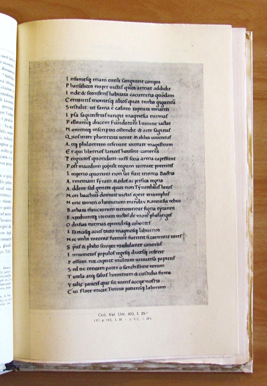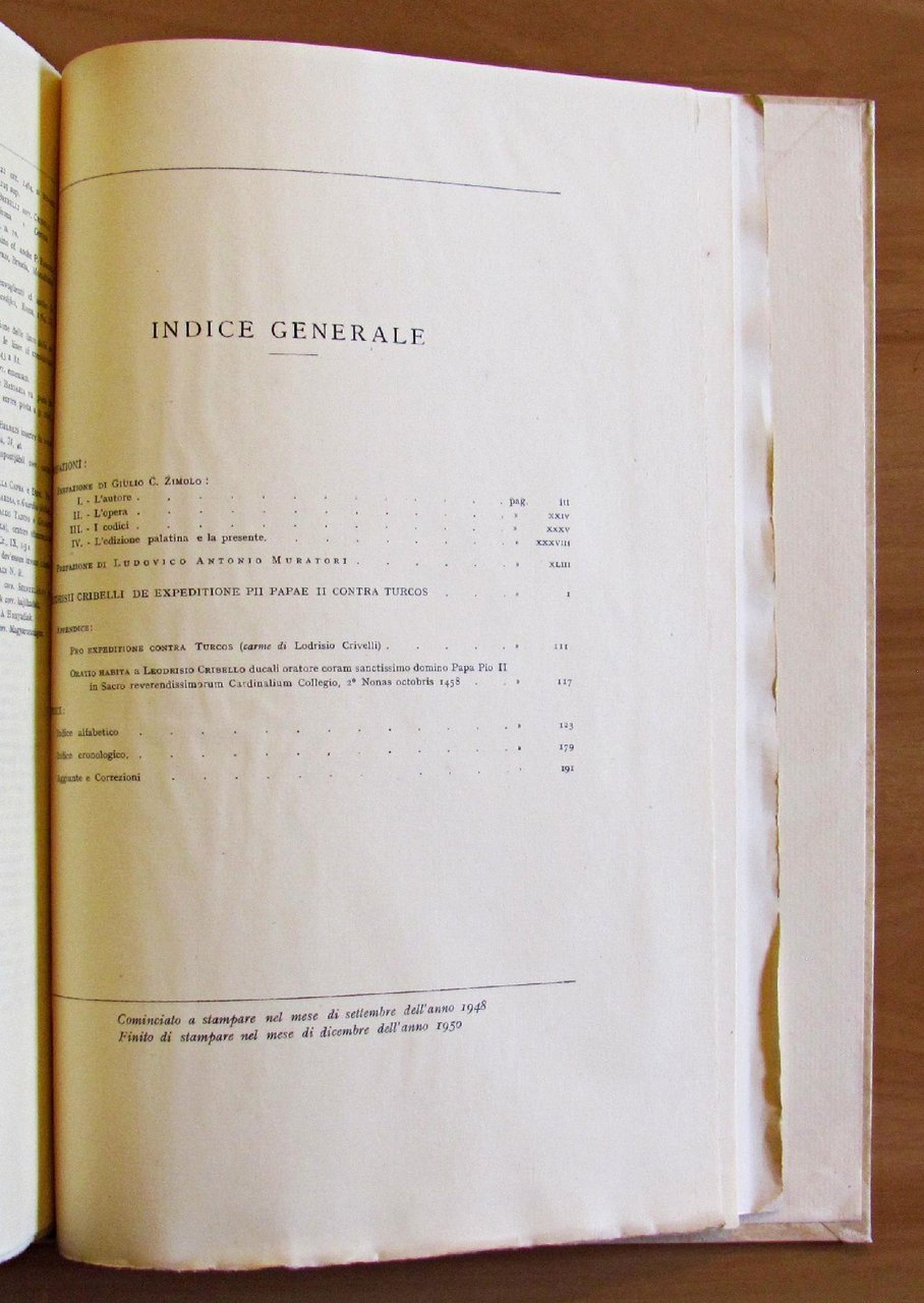 Rerum Italicarum Scriptores Raccolta degli Storici Italiani dal Cinquecento al Millecinquecento ordinata da L.A. Muratori. Con la direzione di Giosuè Carducci, Vittorio Fiorini, Pietro Fedele. Volumi stampati in quarta su carta a mano filogranata, rilegati alla bodoniana in tipo pergamena. Tomo XXIII - Parte V. 4 tavole fotografiche in b/n f.t. raffiguranti il codice manoscritto da Leodrisii Cribelli (Leodrisio Crivelli). Zanichelli, Bologna - I edizione 1950. Cartonato editoriale con titoli al dorso. Interno totalmente intonso. Contiene cedola editoriale della raccolta. 24x33,5; pp.192 di testo in latino + XLI di prefazione in italiano. RARO. OTTIMO STATO , Ottimo (Fine)