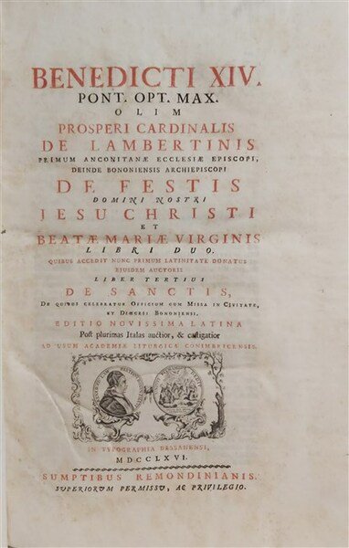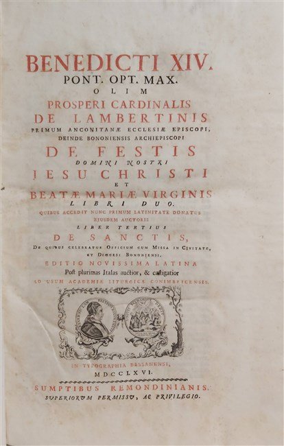 DE FESTIS Domini Nostri Jesu Christi et Beatae Mariae Virginis Libri Duo. Quibus accedit nunc primum latinitate donatus ejusdem auctoris Liber Tertius De Sanctis de quibus celebratur Officium cum Missa in civitate et diocesi Bononiensi. Editio novissima latina post plurimas Italas auctior & castigatior ad usum Academiae Liturgica Conimbricensis.