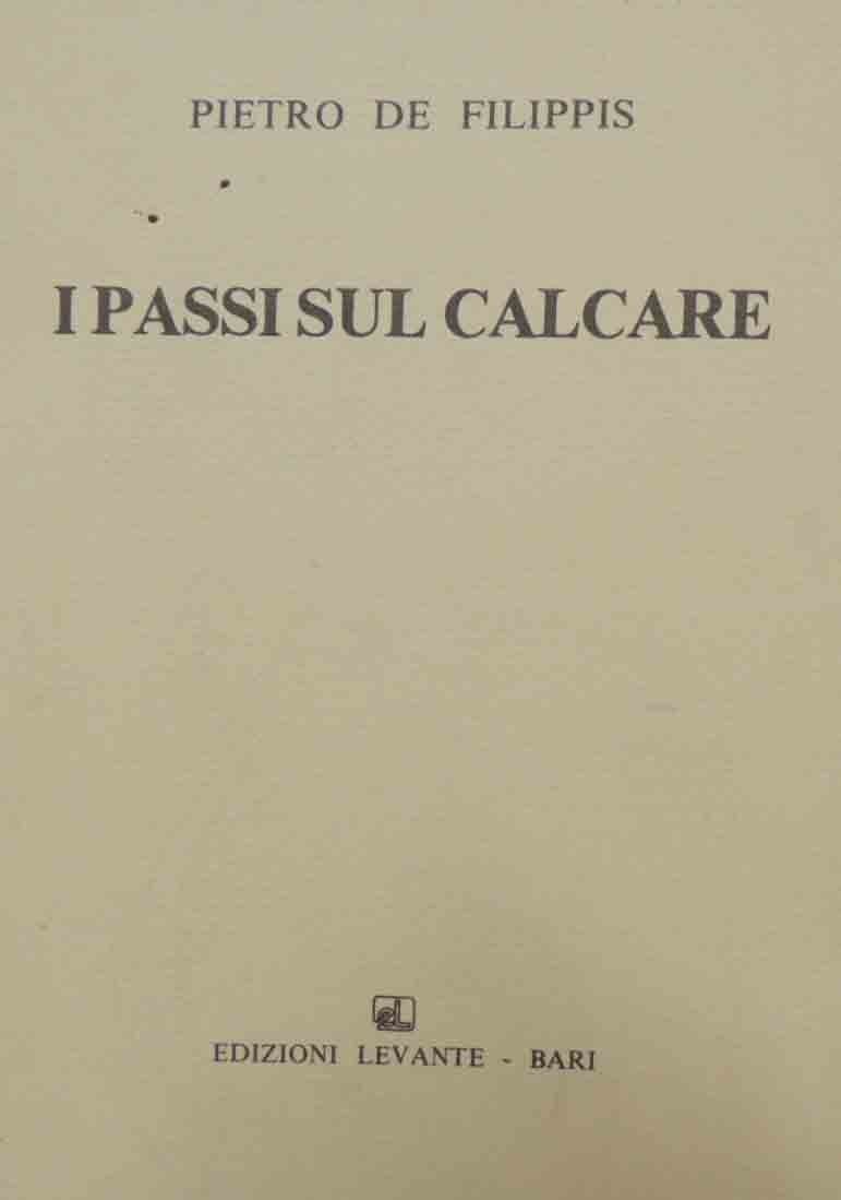 Pietro De Filippis, I passi sul calcare, con immagini di Michele Ardito et al., Edizioni Levante, Bari 1985, pp. 107, ill. b.n., cm 22, br. ed. Collana Controsole. Testi immagini segni. Immagini di Michele Ardito, Michele Damiani, Mimmo Derasmo, Renato Giacovazzo, Dino Latorre, Ignazio Lopez e renato Nosek. Raccolta di liriche prevalentemente ispirate ai paesaggi e alla realtà pugliesi. Al frontespizio, timbro Dono della Provincia di Bari. Brossura un po’ impolverata, lieve brunitura della carta, per il resto perfetto. Raccolta di liriche prevalentemente ispirate dal territorio pugliese.