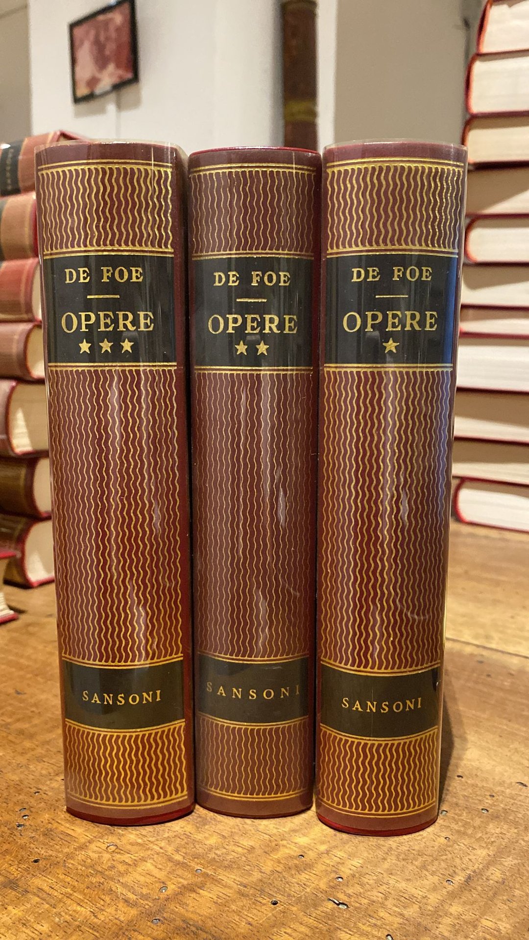 Opera completa in 3 volumi. le opere contengono rispettivamente : ( vol 1 )APPARIZIONE DI MRS VEAL, AVVENTURE DI ROBINSON CRUSOE, LE AVVENTURE DEL CAPITANO SINSLETON; (vol 2) FORTUNE E SFORTUNE DELLA FAMOSA MOLL FLANDERS, DIARIO DELL'ANNO DELLA PESTE, LE AVVENTURE DEL COLONNELLO JACK ; (vol 3) L'AMANTE FORTUNATA OVVERO LA LADY ROXANA, STORIA DELLA SINGOLARE ESISTENZA DI JHON SHEPPARD, VITE E IMPRESE DEL DEFUNTO JHONATHAN WILD, VIAGGIO ATTRAVERSO L'INTERA ISOLA DELLA GRAN BRETAGNA, PAGINE DA "THE REVIEW", PAGINE DALL'EPISTOLARIO. Rilegato in pelle. Incisioni in oro ed etichetta nera sul dorso. Condizioni ottime, quasi nuovo. PAGINE 958 + 977 + 1092. N'37-38-39