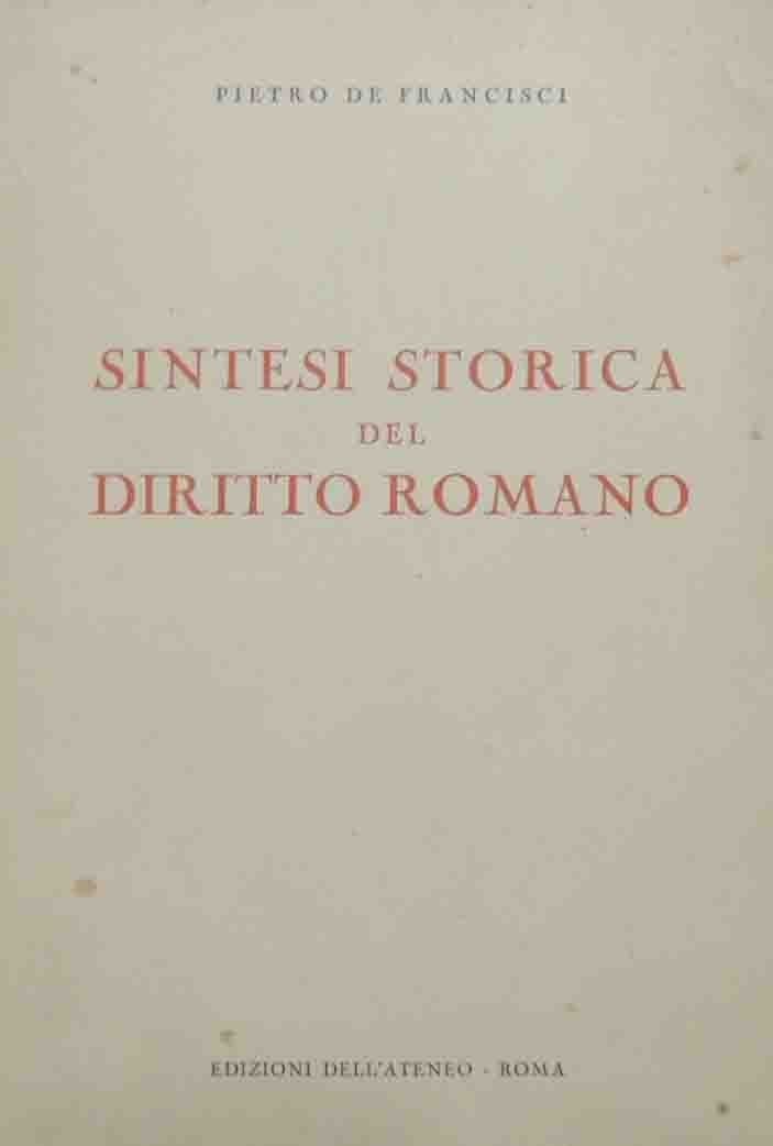 Pietro De Francisci, Sintesi storica del diritto romano, Edizioni dell’Ateneo, Roma s.d. (1948?), pp. XII, 568, cm 25, br. ed. Minime tracce d’uso alla brossura, leggere sottolineature a biro alle prime 60 carte, lieve brunitura della carta, per il resto ben conservato.