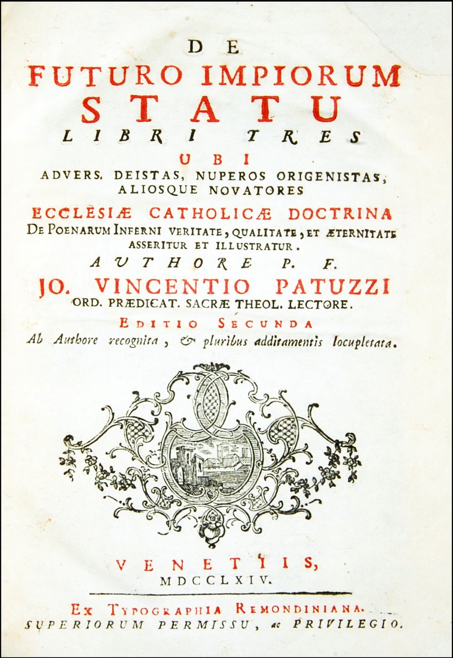 De futuro impiorum statu libri tres ubi aduers. deistas, nuperos origenistas, aliosque nouatores ecclesiae catholicae doctrina de poenarum inferni veritate, qualitate, et aeternitate asseritur et illustratur. Authore p.f. Io. Vincentio Patuzzi … Editio secunda ab authore recognita, & pluribus additamentis locupletata