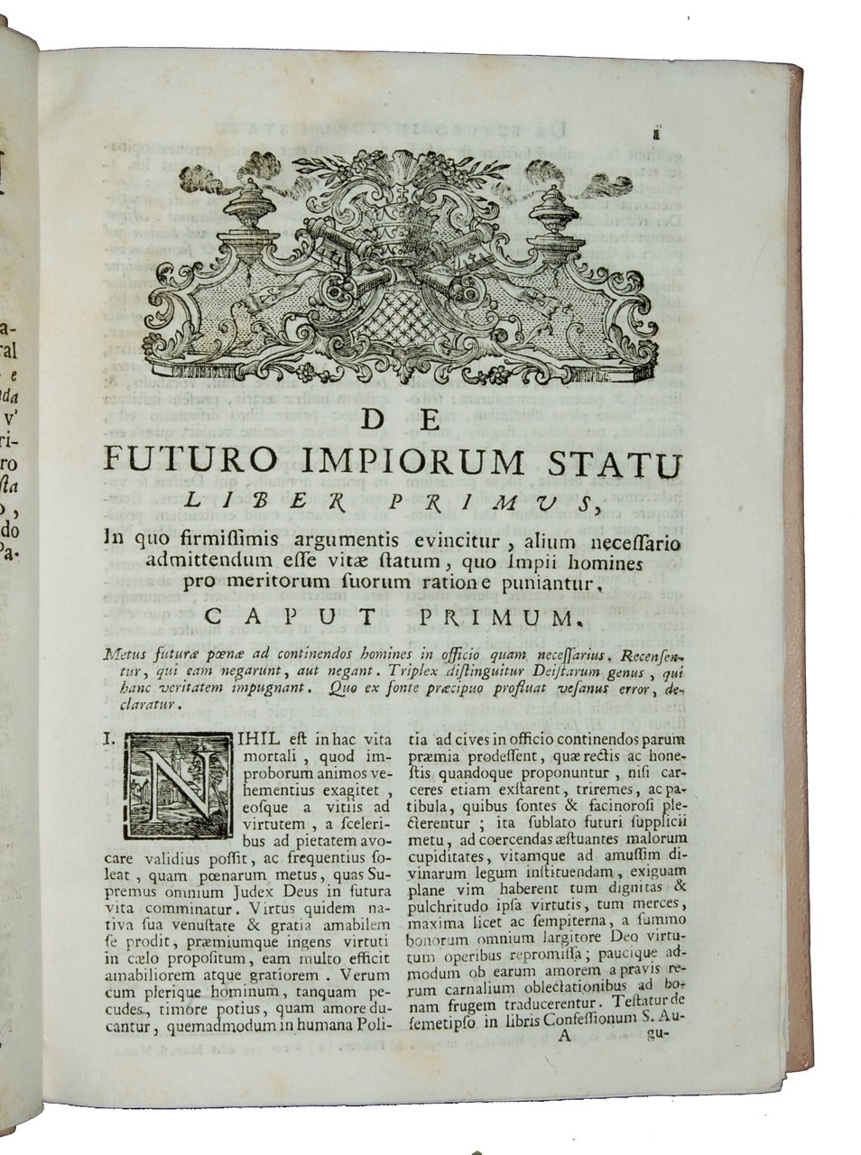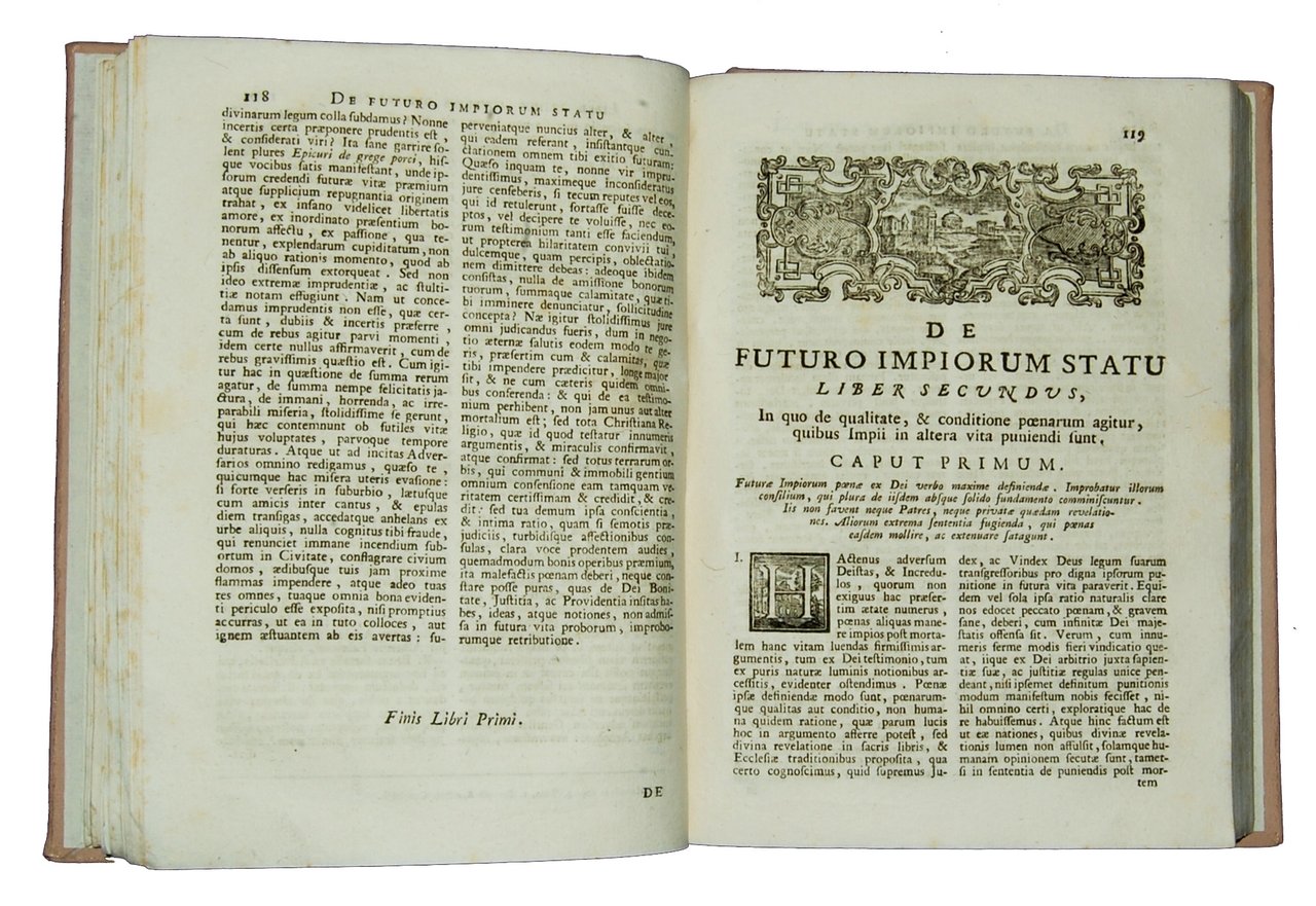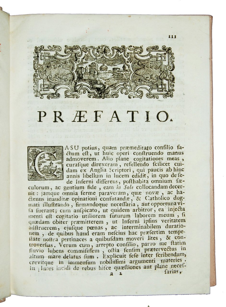 4to (232x170 mm), modern light leather binding with gilt title at spine; pp. XXIII, [1], 334, [2]. Title-page in red and black types. Xyl. vignette at title-page. Interesting treatise by the Dominican theologian Patuzzi, about the existence, location and pains of Hell, with the opinions of philosophers, church fathers and theologians, and addressing topics such as immortality of the soul, beliefs of ancient peoples, and especially theories not in line with the Church. Includes arguments showing the reality, character and eternity of infernal punishments, and discussion of how this position is entertained by Jews, Muslims and other inhabitants of Asia and America, as well as by orthodox Christians. Rif.: IT\ICCU\BRIE\000611. OCLC, 65779047 (3 copies in the Netherlands), 929025111 (one copy in Spain). Apparently no copy in USA. Cond.: A very good copy in a modern leather binding.