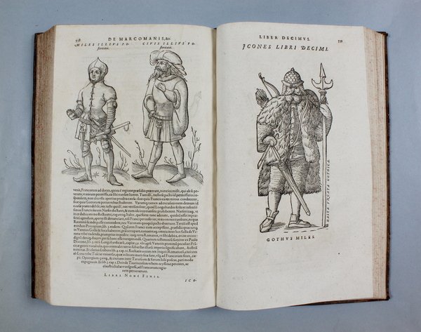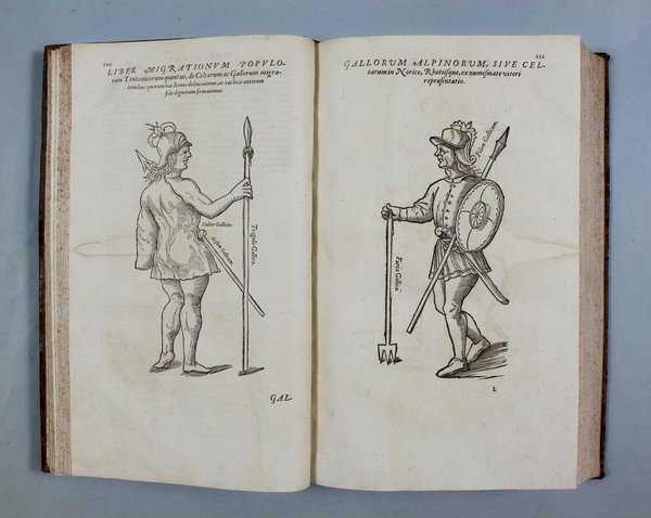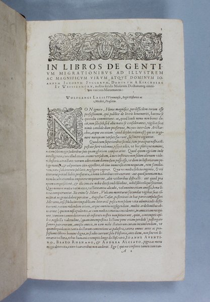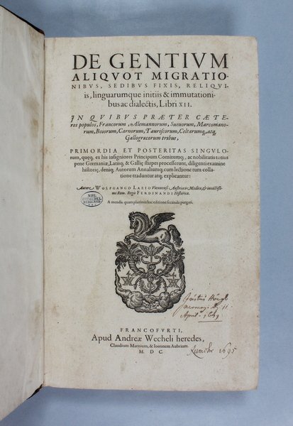 In-folio; 675 pp., 37 pp. nn.; numerose illustrazioni incise a piena e mezza pagina nel testo ad opera dell'autore stesso e raffiguranti guerrieri appartenenti ai diversi popoli, fregi e iniziali ornati. Legatura coeva in tutta pelle bazzana, tassello in marocchino con titolo, piccoli stemmi nobiliari e fregi in oro al dorso (minime tracce d'uso a una cerniera), tagli spruzzati. Firme di possesso manoscritte al frontespizio, datate rispettivamente 1609 e 1695. Bell'esemplare (gora non grave alle pp. 293-296). Edizione ampliata e corretta. Importante opera di etnografia, geografia e linguistica sulle migrazioni di popoli avvenute nell'Altomedioevo che furono alla base della successiva sistemazione etnica e linguistica dell'Europa. In particolare il Lazius si occupa delle genti slave. Da sottolineare la presenza delle belle xilografie che raffigurano i costumi delle varie popolazioni e che sono intagliate con gusto e perizia. Adams L 349. Lipperheide Bf 1.