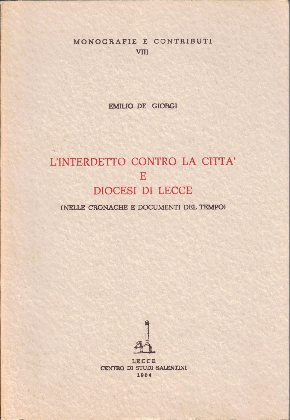 Emilio De Giorgi, L’interdetto contro la città e diocesi di Lecce. Nelle cronache e documenti del tempo, Centro di studi salentini, Lecce 1984, pp. 102, cm 24, br. ed. Collana Monografie e contributi, vol. 8. Indice: Introduzione – Le condizioni storiche in cui maturò l’Interdetto – I precetti dell’Interdetto – Lo sfratto dal Regno dle Vescovo –Conseguenze dell’Interdetto – Il breve pontificio e gli effetti della scomunica – Lecce nel periodo dell’Interdetto – Il ritorno del Vescovo e la fine dell’Interdetto – I principali conventi e monasteri esistenti a Lecce nel ‘700 – Appendice bibliografica – Bibliografia generale – Bibliografia particolare. Minimi segni del tempo, per il resto perfetto.